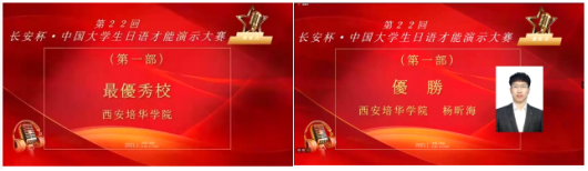 在10月30日举办的第22届“长安杯·中国大学生日语才能演示大赛”中,学校人文与国际教育学院外语系日语专业学生杨昕海凭借出色表现,荣获大赛乙组一等奖,西安培华学院荣获“最优秀学校奖”,我校日语专业教师小泽一博获得“优秀指导教师”。