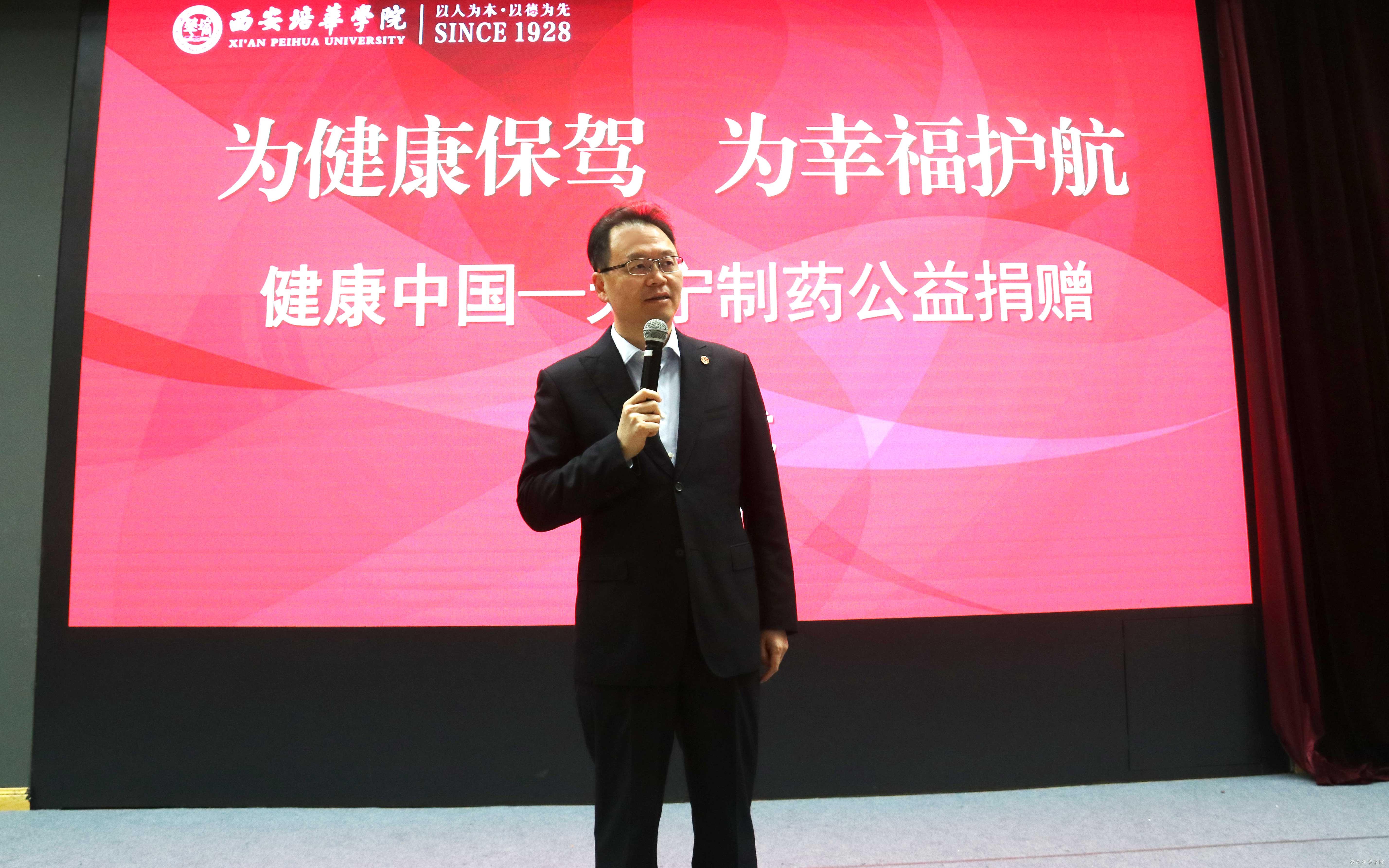 随后陕药集团天宁制药有限责任公司营销中心总监拓兴伟发言,他讲到本次捐赠基于企业社会责任和义务,也代表了企业对祖国接班人的关心与爱护,能为培华学院办点实实在在的事,是天宁制药应尽的社会责任,也是为人类健康事业贡献一份“为健康保驾、为幸福护航”的天宁力量。