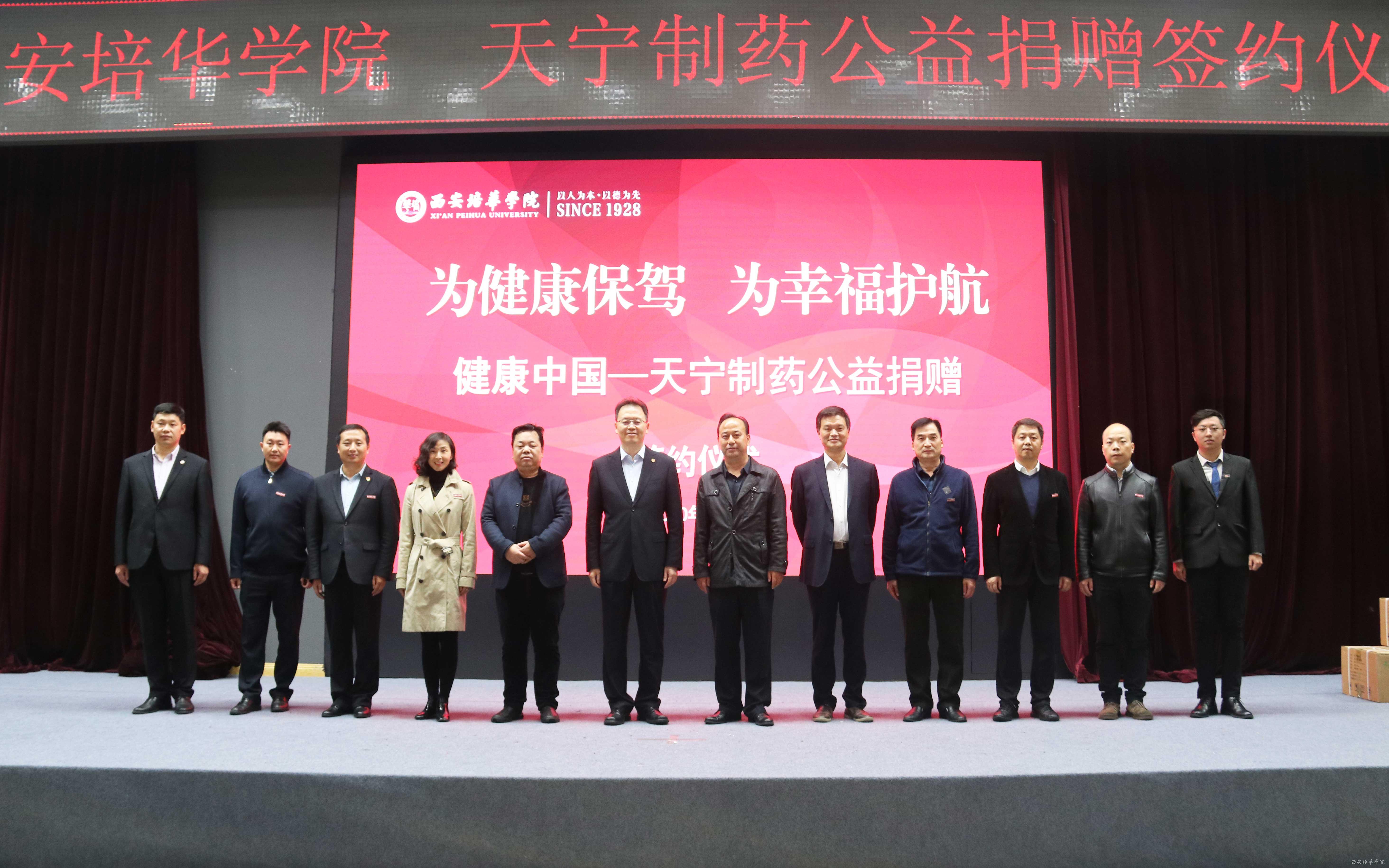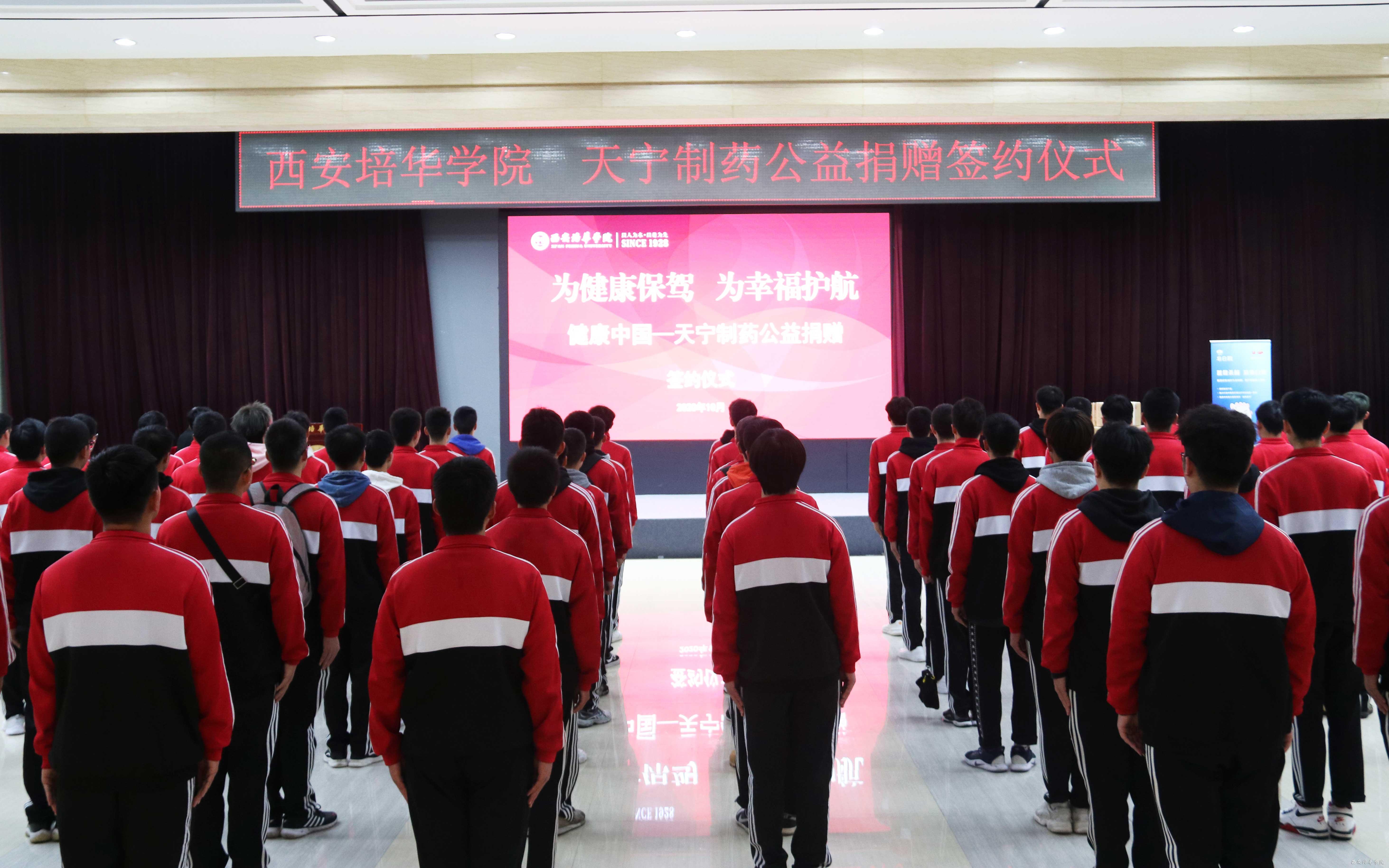 10月15日下午,由陕药集团天宁制药有限责任公司主办、学校党委学工部 学生服务中心承办的“为健康保驾 为幸福护航”公益捐赠活动在西安培华学院启动。天宁制药有限责任公司营销中心总监拓兴伟、健康导报社副社长肖刚、健康导报社执行总编辑王仕伟、西安培华学院理事长姜波、校党委副书记、副校长姚文静、学院院办主任李健、党委学工部部长、学生服务中心主任蔡亮、学院党委宣传部部长柳雨、西安培华学院医院院长李旭军、培华学院医学院常务副院长扈国栋、培华学院后勤服务中心副主任张静远及200名入学新生代表参加公益捐赠活动。