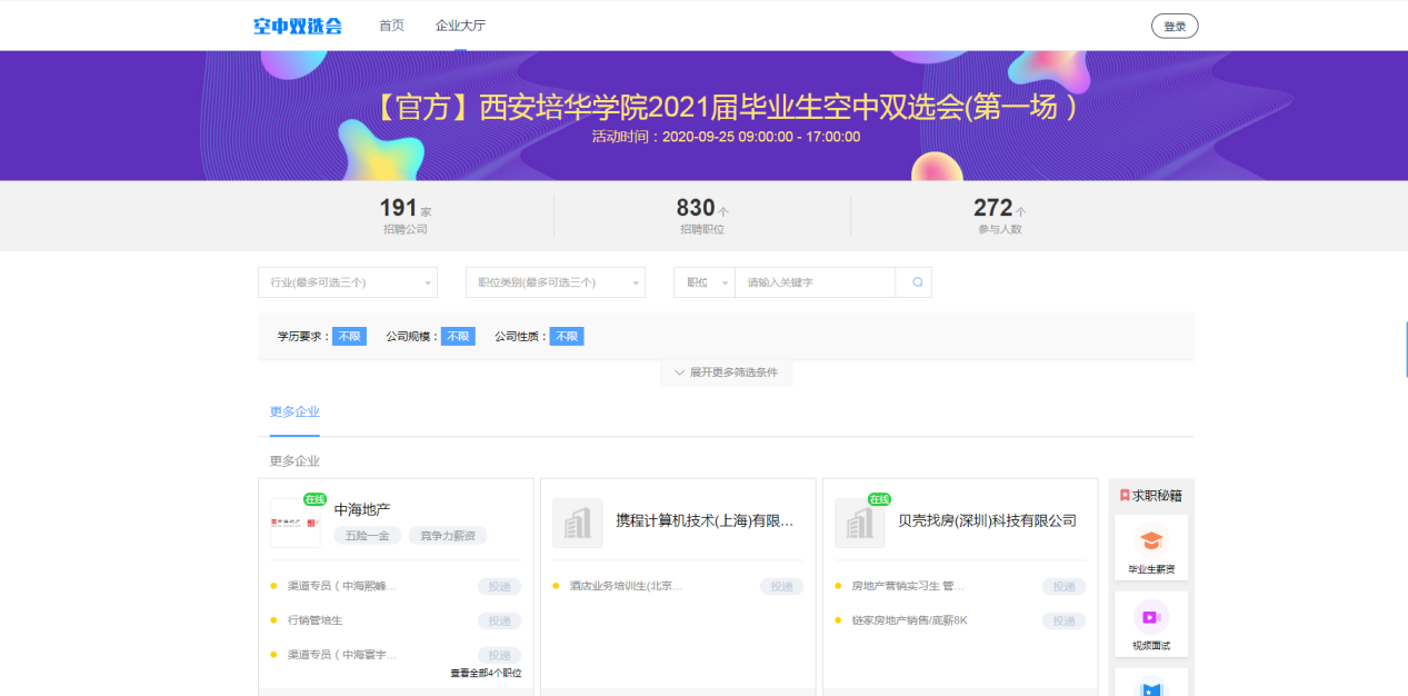 随着国内疫情防控形势逐渐好转,为深入贯彻落实国家促进就业的决策部署等各项事宜,帮助2021届毕业生充分就业、高质量就业、精准就业,满足招聘单位的用人需求,学校决定正式启动2021届毕业生校园招聘服务工作,诚邀各用人单位参会,选聘优秀毕业生。9月25日,我校联合智联招聘成功举办“西安培华学院2021届毕业生空中双选会(第一场)。