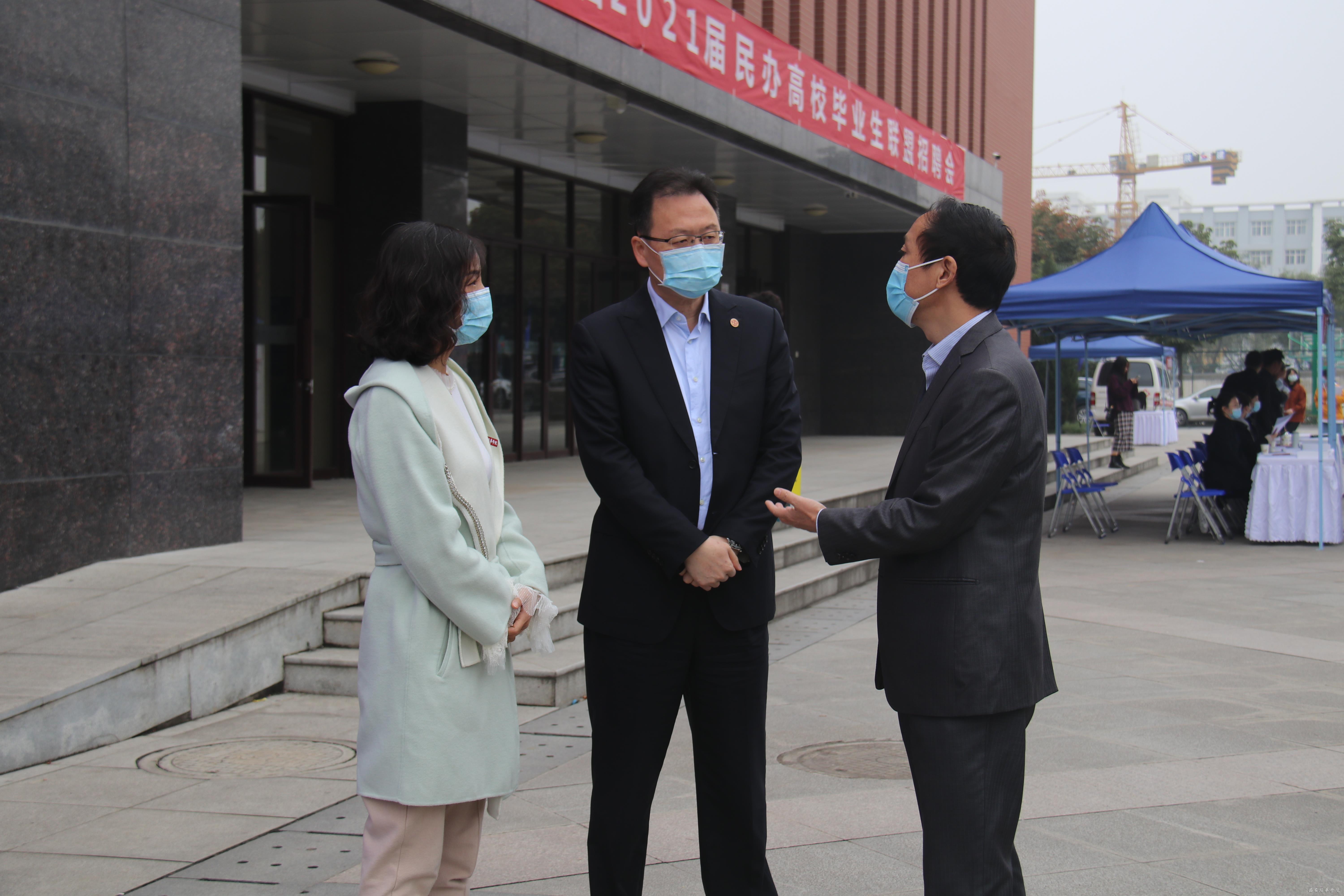 招聘会现场,陕西省教育工委、陕西省教育厅一级巡视员朱征南,西安培华学院理事长姜波、校长李映方、党委副书记、副校长姚文静,陕西省教育厅高校学生工作处三级调研员白炀,陕西省高等学校毕业生就业服务中心主任陈靖,西安翻译学院、西安外事学院、西安思源学院等就业部门负责人,学生服务中心、各二级学院领导到现场调研指导。与现场用人单位招聘负责人就招聘单位的人才需求、疫情对于单位招聘工作的影响以及对高校人才培养的意见建议等方面进行沟通。