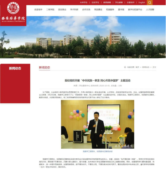 利用多媒体平台开展活动。通过“两微一端”平台(西安培华学院“培华学工在线”和“培华青年”微信公众平台、西安培华学院校媒官方新闻网站)等多种载体和有效途径开展“民族团结一家亲,同心共筑中国梦”活动。各学院、学生组织广泛利用网络平台等宣传阵地,大力开展民族团结进步宣传教育,大力弘扬社会主义核心价值观,创新教育方法,用主旋律占领主阵地。激励学生树立“成长成才、报效祖国”的强烈愿望,切实肩负起应有的社会责任,促进民族大团结,共创和谐校园。