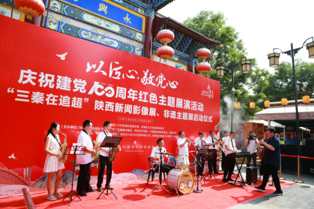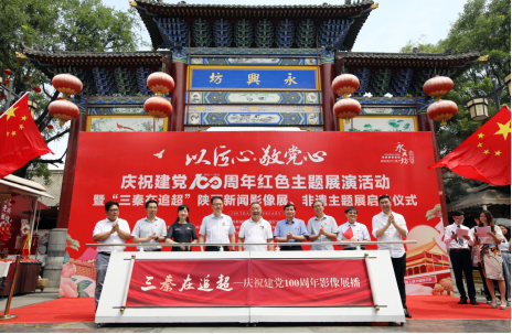 6月30日上午,“三秦在追超——庆祝建党100周年影像展播”首站展播走进西安永兴坊。来自省、市、区相关部门领导、企事业单位、高等院校、行业协会、非遗传承人、媒体等约500余人参加了本次活动。