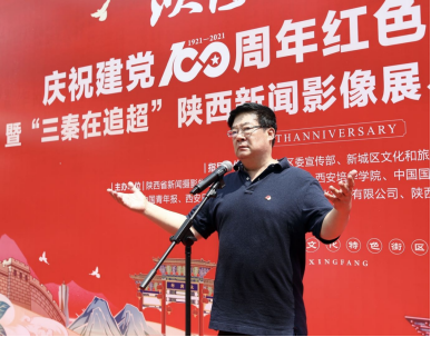 西安培华学院传媒学院院长杜耀峰指出,本次影像展共展出150幅作品,分九个板块,从创立新中国、建设新中国到经济大发展、人民得幸福等方面进行展播。百年来,陕西人民在中国共产党领导下自力更生、艰苦奋斗,建设新中国的艰难历程跃然眼前。他深情的分享了老一代新闻摄影家为了拍摄这些珍贵影像资料不畏艰难、不怕牺牲的职业精神,为他们用影像的方式记录了建党100周年来三秦大地的沧桑巨变表示了崇高的敬意。
