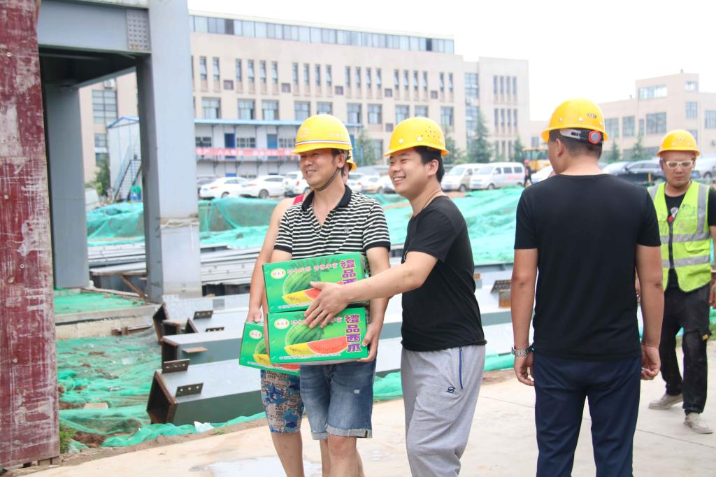 校长助理姜涛将400余斤西瓜等降温物资,送到了奋战在高温一线的基建人员手中,向他们表达祝福和感谢,并叮嘱工人时刻牢记高温季节施工安全注意事项,防止安全事故和高温中暑事件发生,确保人身安全。