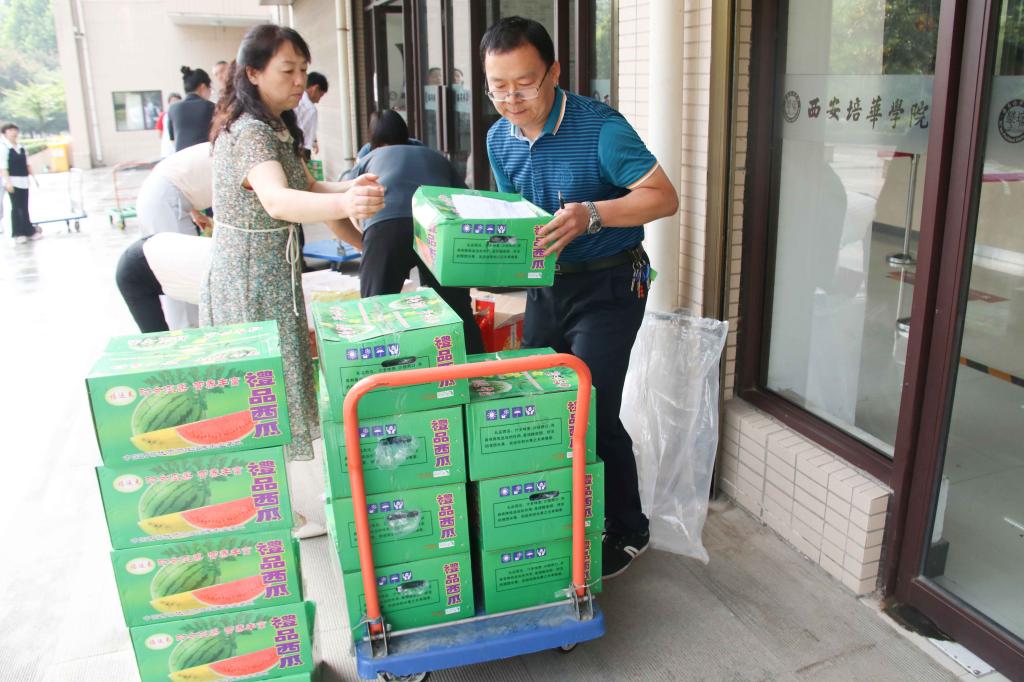 西安培华学院监事会、工会主席徐国富为教职工发放清凉礼包。
