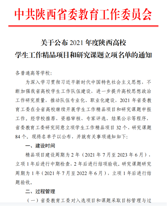 根据《关于公布2021年度陕西高校学生工作精品项目和研究课题立项名单的通知》的文件,学校党委学生工作部蔡亮主持的《三聚三融联动:红色基因融入大学生爱国主义教育实践研究》获得“学生工作精品项目”立项,传媒学院高嘉炜主持的《新时代陕西民办高校辅导员培训体系构建研究》获得“学生工作研究课题”立项。