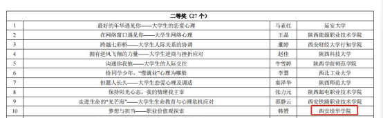 潜能发展中心主任韩赟的教案《梦想与担当——职业价值观探索》荣获“陕西高校第三届心理健康教育优秀教案二等奖”,潜能发展中心吕改莲老师的教案《不负,不弃,让生命之花安然绽放——珍爱生命》荣获“陕西高校第三届心理健康教育优秀教案三等奖”;