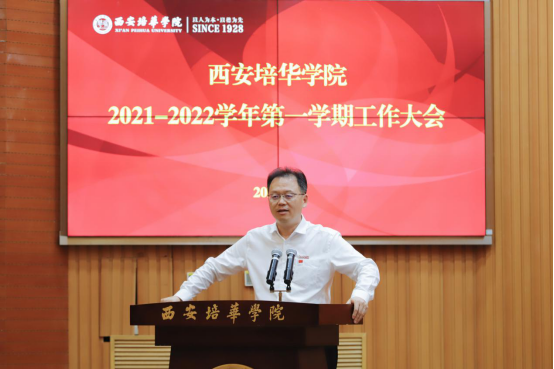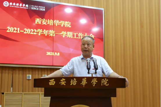 9月8日,西安培华学院于明德楼报告厅召开了2021-2022学年第一学期工作会议,李映方校长作工作报告、姜波理事长作重要讲话,党委书记罗新远主持会议。全体校领导,院领导、党委委员、行政部门主管岗位以上人员、二级学院主要负责人等参加会议。