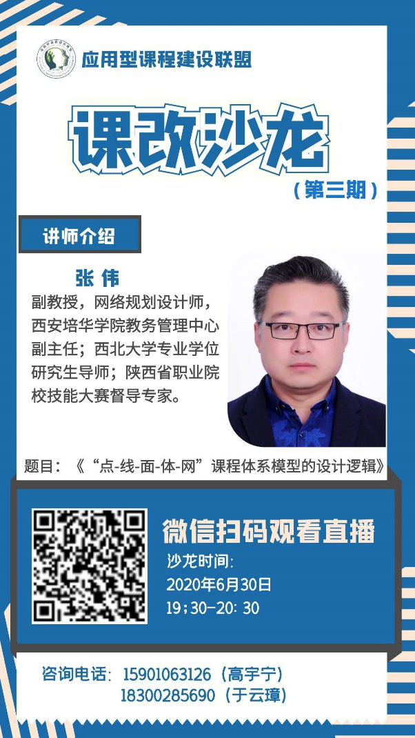 6月30日19:30-21:00,教务管理中心张伟副主任受应用型课程建设联盟的邀请,参加第三期课改沙龙线上分享活动,并作《“点-线-面-体-网”课程体系模型的设计逻辑》主题分享,来自全国高校的900余名教师参加了此次活动。