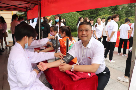 在活动现场,医学院党员志愿者还为培华师生现场进行中医按摩并进行血压测量服务。