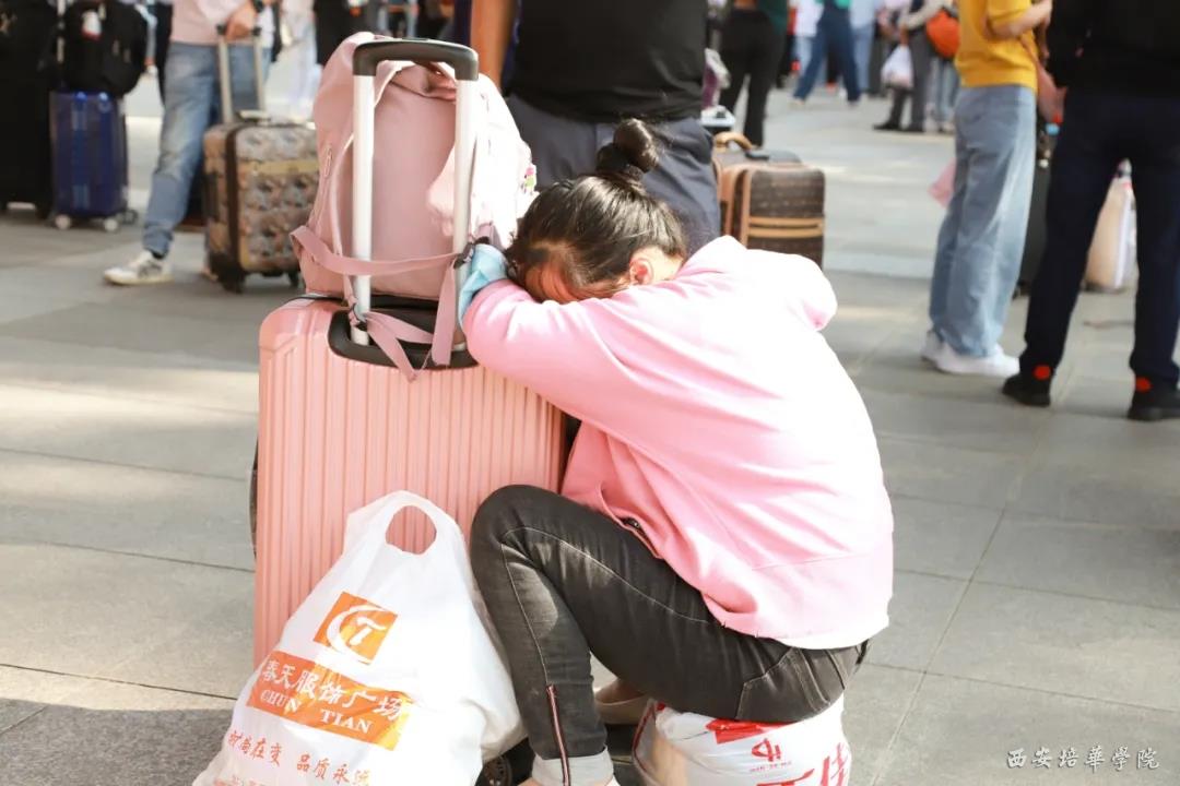 图片中的母亲趴在行李厢上小憩,本不愿打扰这位疲惫的母亲休息,但因为太阳很晒,志愿者还是叫醒这位家长,想让她到家长休息室好好休息,但这位母亲却说:“不用啦,谢谢,孩子这次上大学,再见也要好几个月后,我就在边边上多看看娃”。