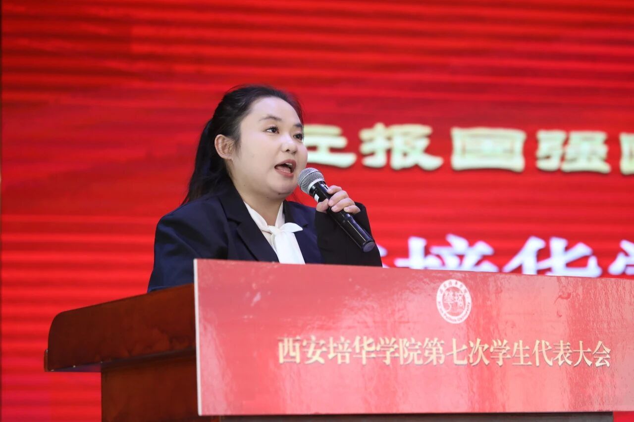 西安培华学院第六届学生会执行主席刘蕊作题为《务实笃行结硕果 接力前行谱新篇》的工作报告