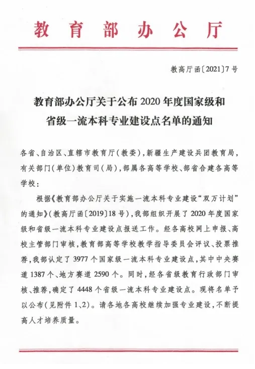 据悉,一流本科专业建设“双万计划”是教育部全面贯彻落实全国教育大会和新时代全国高校本科教育工作会议精神,推动新工科、新医科、新农科、新文科建设,做强一流本科、建设一流专业、培养一流人才,全面振兴本科教育,提高高校人才培养能力,实现高等教育内涵式发展的重要举措,从2019年开始分三年建设10000个左右国家级一流本科专业点和10000个左右省级一流本科专业点。