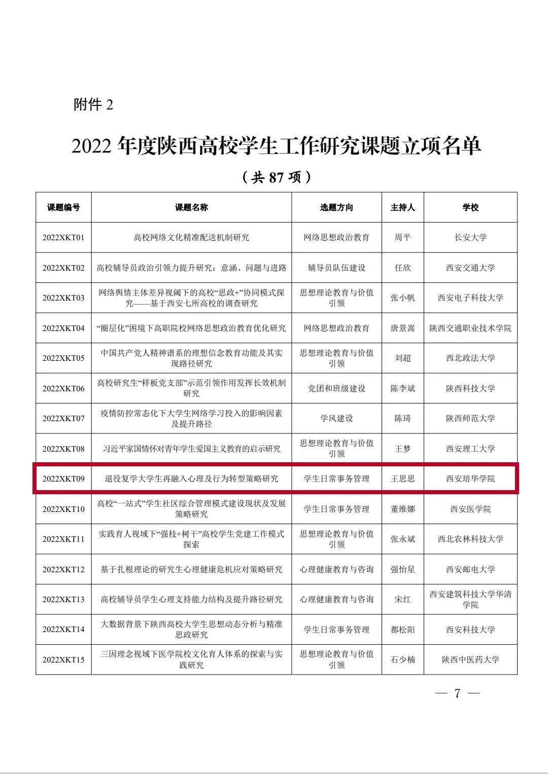 近日,中共陕西省委教育工委发布了《关于公布2022年度陕西高校学生工作精品项目和研究课题立项名单的通知》,我校潜能发展中心主任韩赟主持的《“五心同筑、双元互动、五育并举”——高校525心理育人工程的实践与创新》获批学生工作精品项目立项,会计与金融学院辅导员王思思主持的《退役复学大学生再融入心理及行为转型策略研究》获批学生工作研究课题立项。