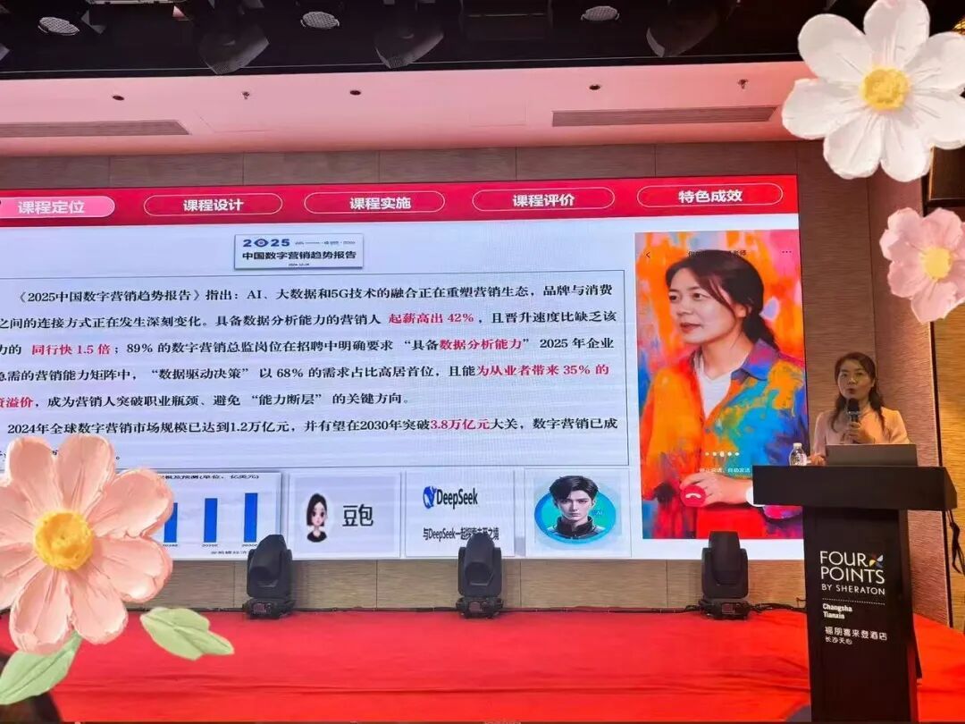 学校团队紧扣“双师+PBL”师生双主体教学模式,通过专业教师与企业导师协同,构建了课前、课中、课后全流程产教融合的教学体系。比赛中,丁院长以行业报告与数据图表为支撑,深度对接企业对数据分析能力的需求,突出“数据驱动决策”的课程特色,并展示了数字营销市场规模的快速增长趋势。