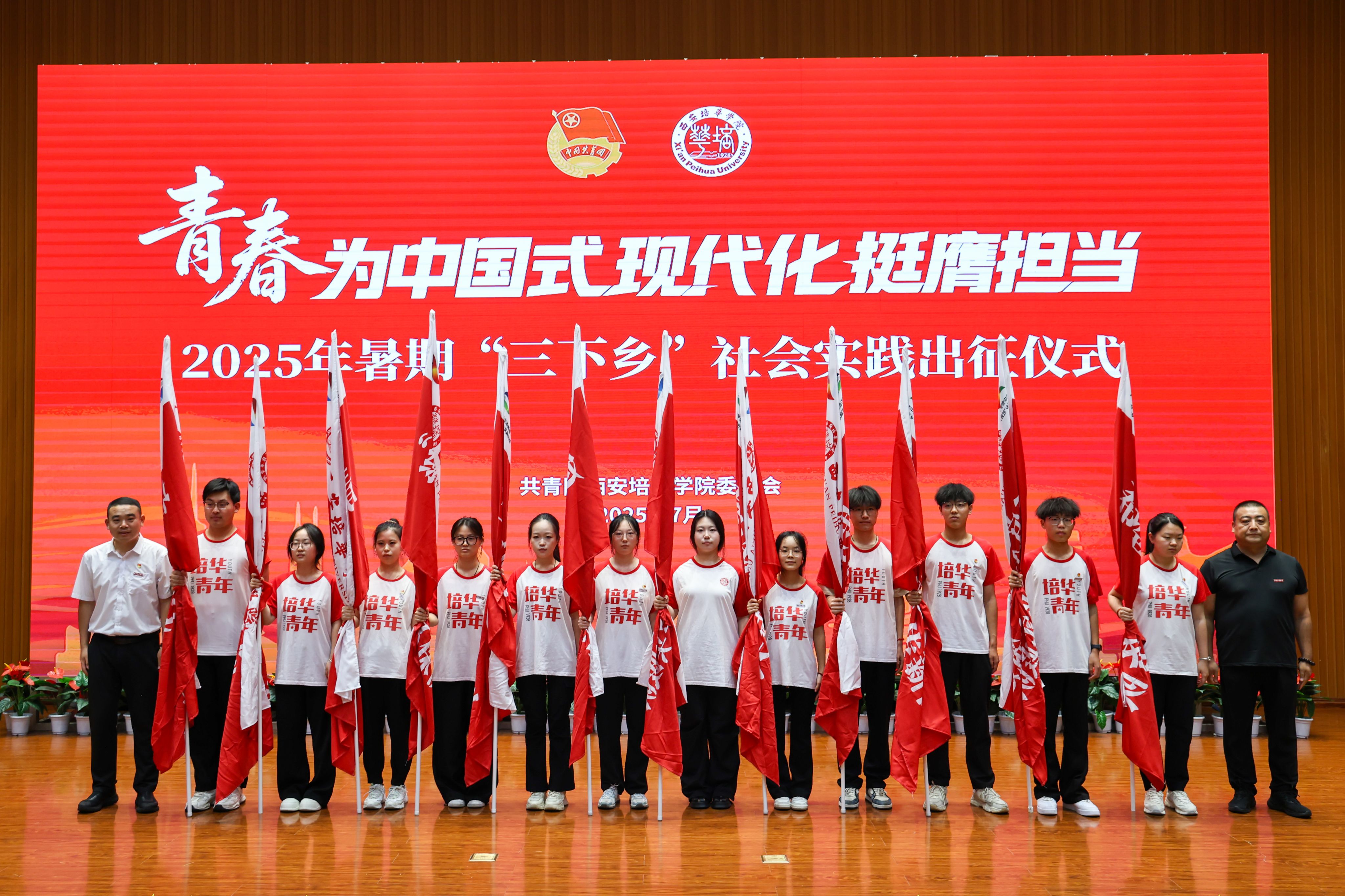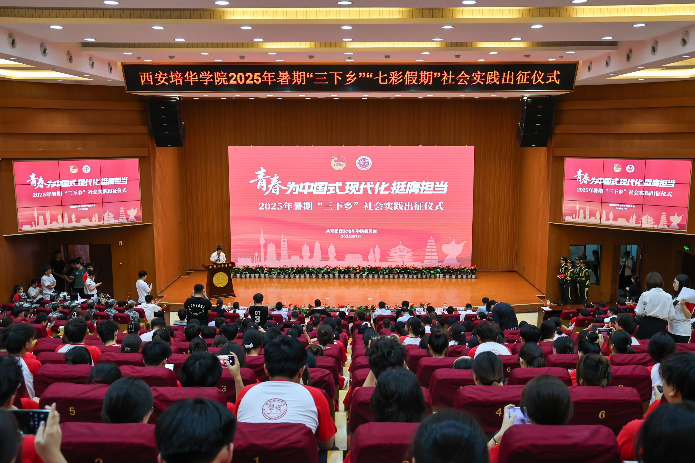 7月1日,西安培华学院2025年暑期“三下乡”社会实践出征仪式在图书馆报告厅举行,西安市青年志愿者行动指导中心主任赵娟,西安市灞桥区团委书记吴彬彬,学校党委书记刘锋,党委副书记、副校长姚文静,党委副书记蔡亮以及各院(部)、中心相关领导,校级立项团队指导老师代表,实践团队代表等400余师生齐聚一堂,共赴实践之约。