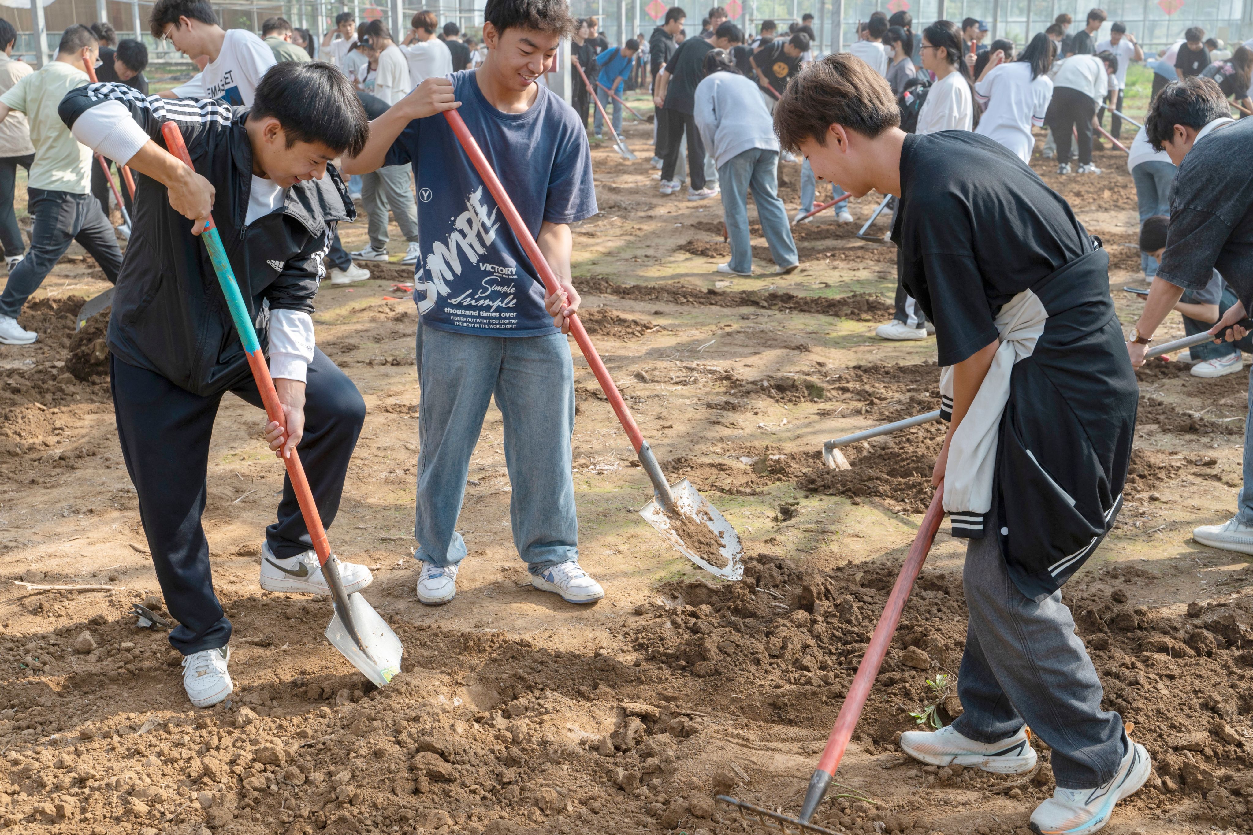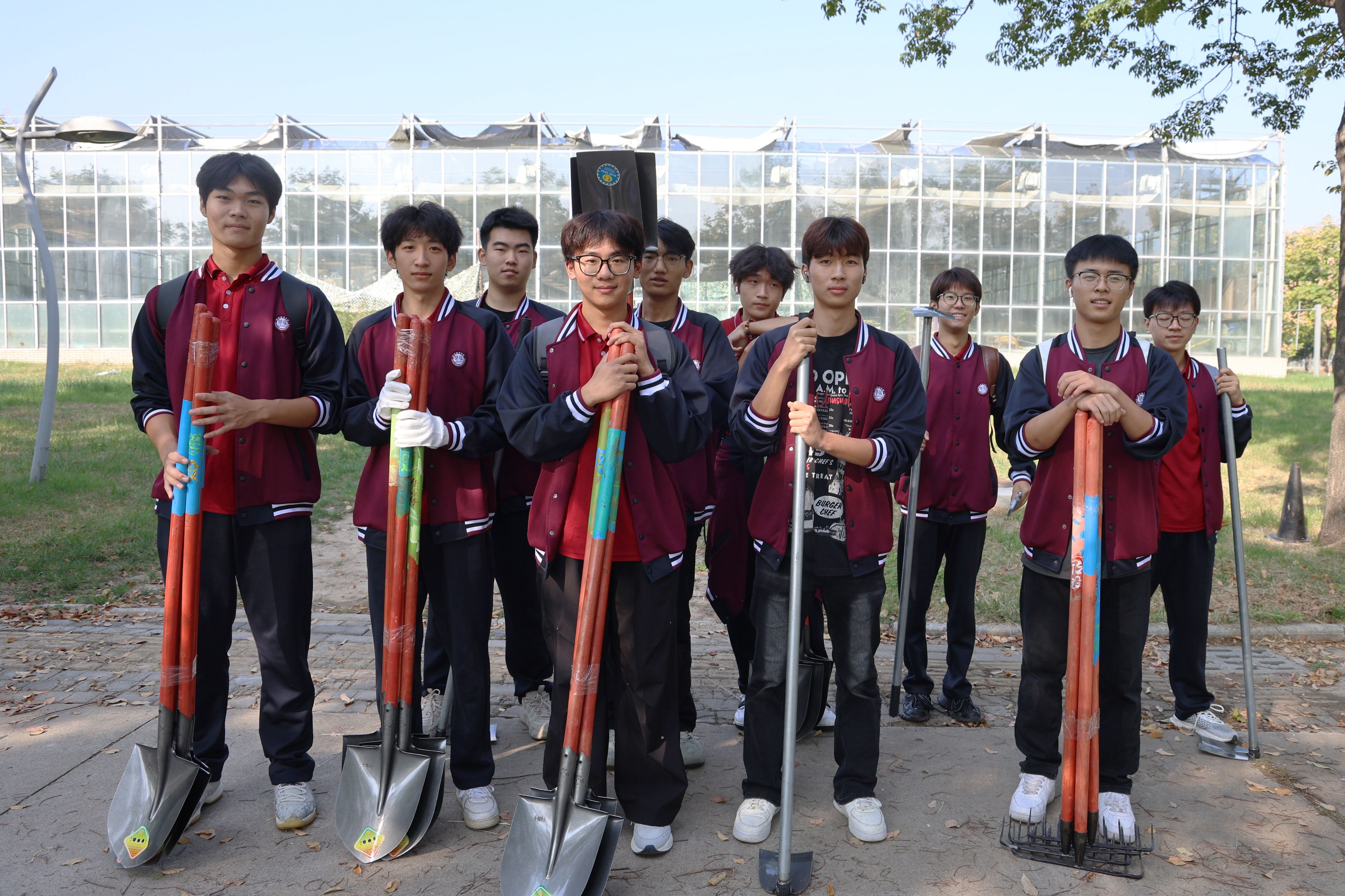 在劳动教育老师们的带领下,大一的学生们按照班级分组领取了各自的劳动工具铁锹、锄头、铲子、篱笆这些平日里很少接触的农具如今成了他们手中的“宝贝”。