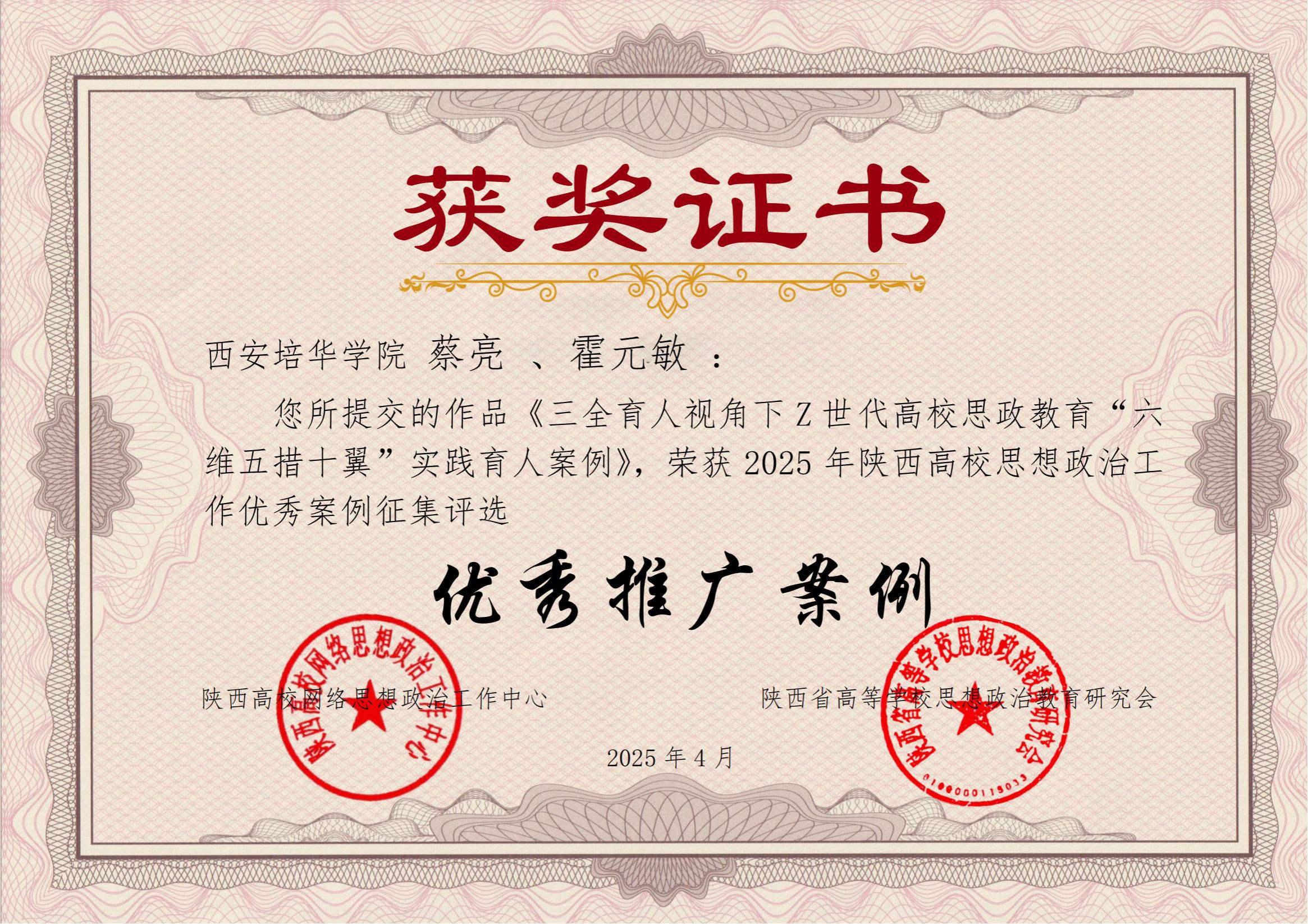 近日,在陕西高校网络思想政治工作中心、陕西省高等学校思想政治教育研究会面向全省高校举办的2025年陕西高校网络思想政治工作案例征集活动中,西安培华学院报送的《三全育人视角下Z世代高校思政教育“六维五措十翼”实践育人案例》荣获陕西高校思想政治工作“优秀推广案例”。这一殊荣是对学校思政育人成果的高度肯定。