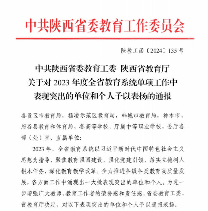 近日,中共陕西省委教育工委、陕西省教育厅发布了《关于对2023 年度全省教育系统单项工作中表现突出的单位和个人予以表扬的通报》,我校教务管理中心获评“高等学校本科教学管理工作表现突出单位”,发展规划与质量建设中心赵巍主任获评“本科教学管理领域表现突出个人”。