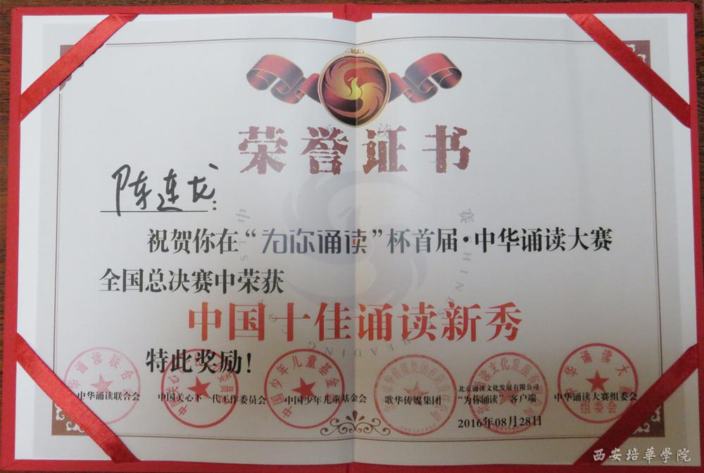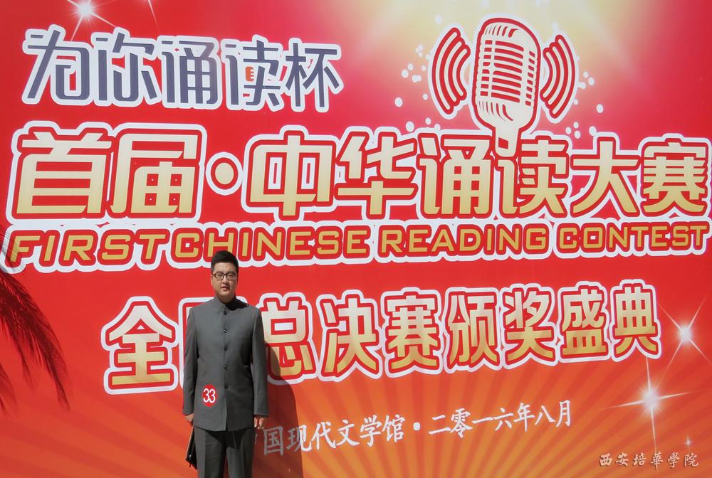 首届中华诵读大赛全国总决赛暨颁奖盛典于8月27日-28日在北京的中国现代文学馆举行。经过激烈的角逐,我校传媒学院青年教师陈连龙作为陕西省唯一的男性选手参加决赛,最终跻身全国前十,荣获首届中华诵读大赛中国十佳诵读新秀。