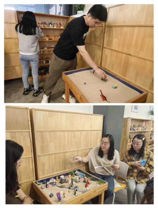 团体沙盘游戏疗法中所有来访者选择一些模型摆放在特定的沙箱里构成一些作品,从而充分表现自己的内心世界,把一些内心冲突和不良情绪无意识地释放和投射在沙盘中,进而活化自我痊愈及成长的力量达到治疗目的。本次团体沙盘体验活动共招募来自不同学院的9名成员,经过近2小时的沙盘体验,老师们全身心地投入到团体沙盘中,通过创造沙盘世界—体验和重建沙盘世界—治疗—记录沙盘世界—连结沙游体验和现实世界,引导师引导各位老师分享摆放玩具的意图、对他人摆放玩具的感受、对作品的整体感受,通过彼此沟通、交流、分享和支持,通过对话、创作、表达,最终让来访者达到:觉察自我内心世界,接纳自我;觉察他人,改变既有思维;换位思考,实现自我成长,得到情绪发泄和自我整合。