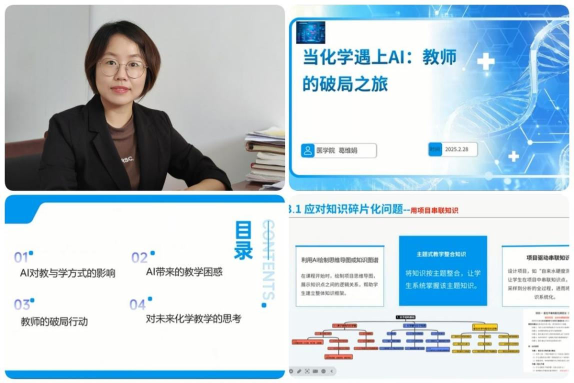 医学院的葛维娟副教授则针对“当化学遇上AI,教师的破局之旅”这一主题进行了深入探讨。她分析了AI冲击下的教学困境,并提出了化学教师的破局行动。葛老师认为,教师们应积极应对挑战,利用AI技术提升教学效果。同时,她还对未来化学教学进行了思考,为参会教师提供了宝贵的启示。
