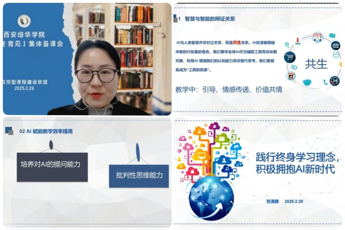 随后,科研管理中心的刘清颖副教授以“践行终身学习理念,积极拥抱AI时代”为题,分享了她的见解。刘老师从智能与智慧的辩证关系出发,强调了教师在备课过程中应端正态度,精准使用提示词,提高备课效率。同时,她还提倡将科研成果融入教学,丰富备课资源,为学生提供更加优质的教学内容。