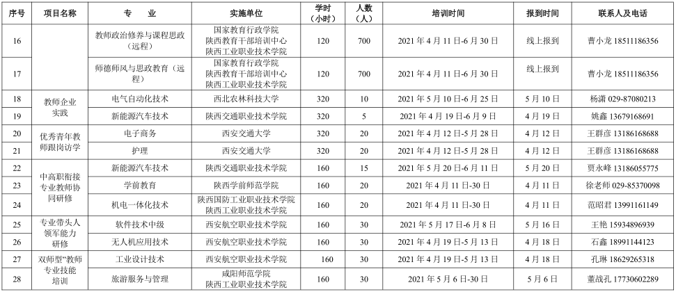 (二)培训及报名时间。根据具体项目计划,项目安排在2021年4月11日至6月30日期间进行。我校参训人员须于4月9日前通过参训人员登录教育部“职业院校教师素质提高计划信息化服务平台”(http://202.113.245.38:8280/train/login.jsp),完成网上注册和报名,相关培训项目验证码附后(详见附件4)。网上报名时要认真阅读报名须知和流程,严格按照培训计划分配的专业填报,个人所有填报内容要详细、准确、规范。