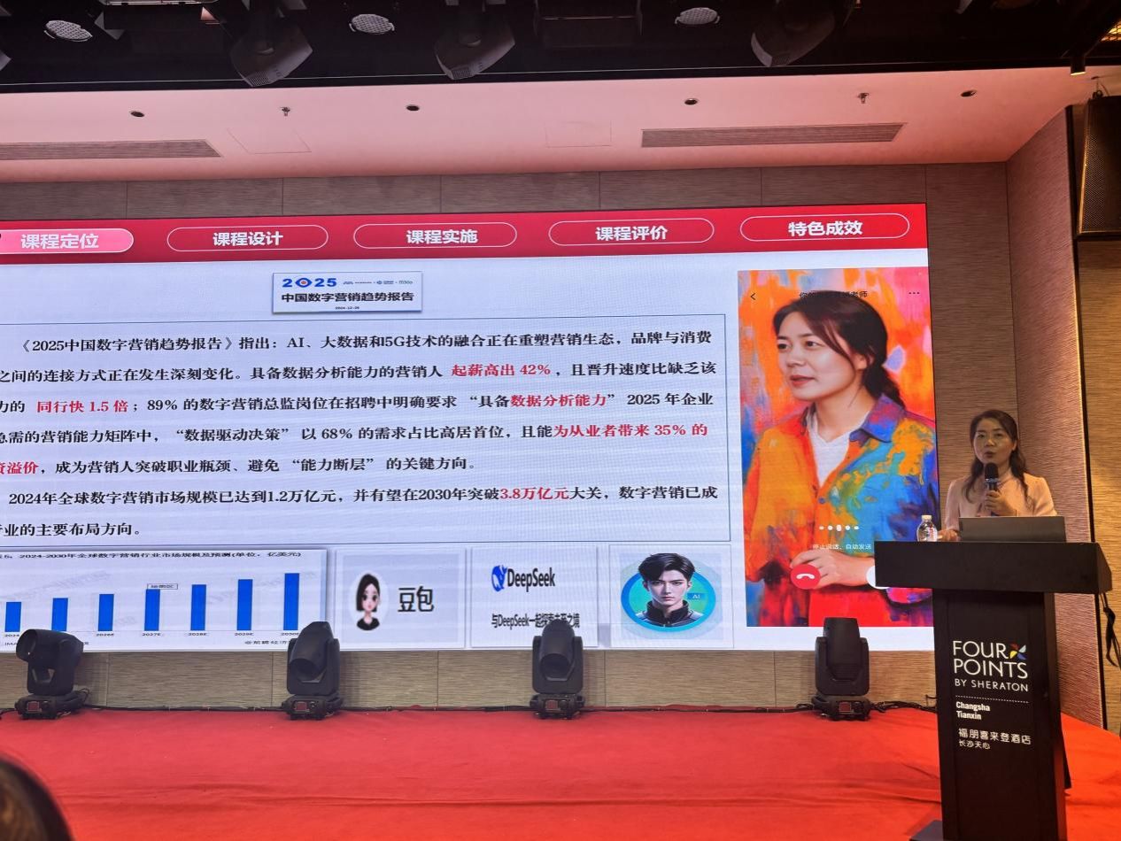 丁阳副院长紧扣“双师+PBL”师生双主体教学模式,通过专业教师与企业导师协同,构建了课前、课中、课后全流程产教融合的教学体系。比赛中,丁院长以行业报告与数据图表为支撑,深度对接企业对数据分析能力的需求,突出“数据驱动决策”的课程特色,并展示了数字营销市场规模的快速增长趋势。