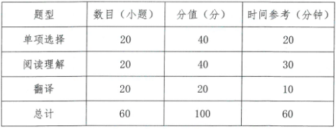 初赛、全国决赛均为客观题。试卷满分为100分,时间为60分钟,共3种题型60道题。参赛选手不得使用任何纸质词典、电子词典和工具书。