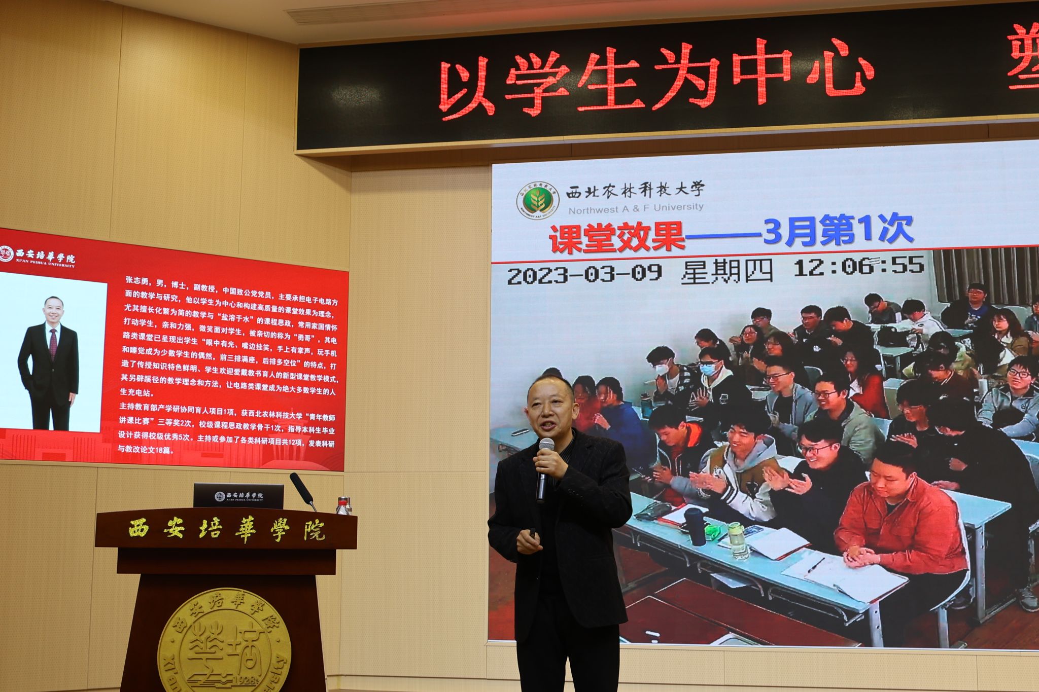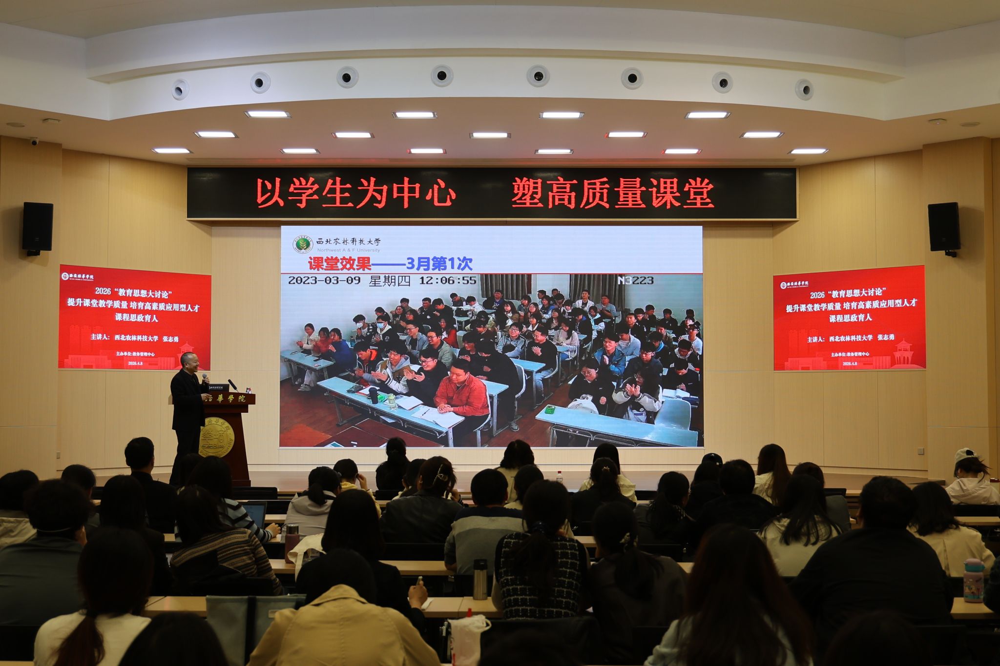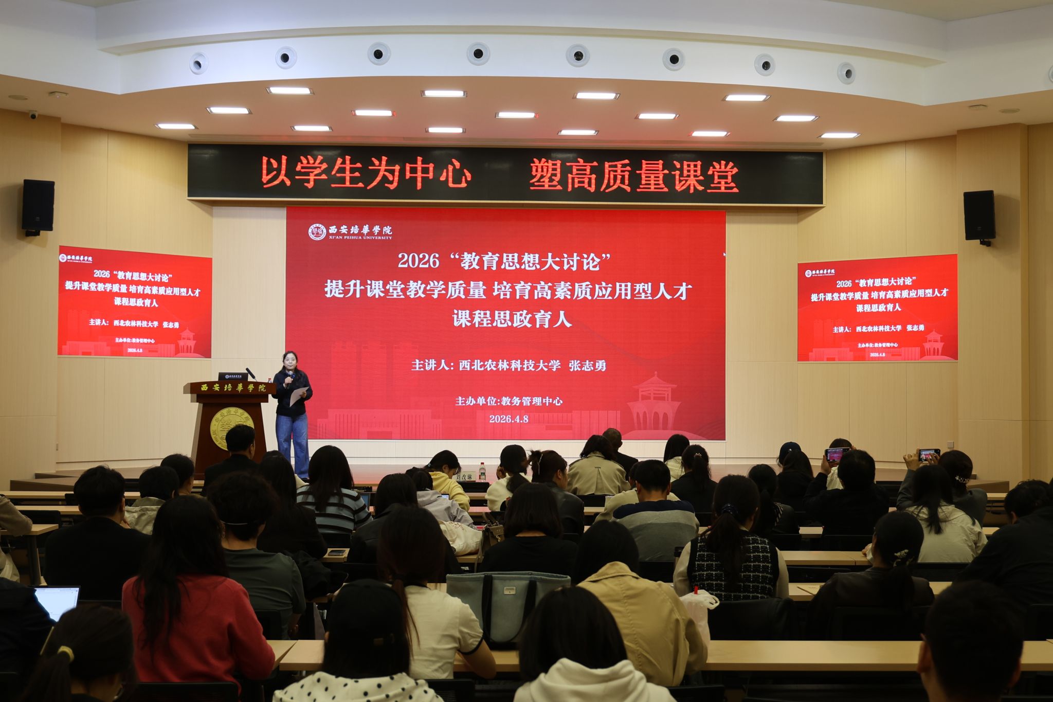 为深入落实学校 2026 年教育思想大讨论工作部署,紧扣“强本申硕”核心任务,全面推进课程思政建设、提升课堂教学质量与育人实效,4 月 8 日下午,西安培华学院在明德楼学术报告厅举办课程思政与课堂教学质量提升专题报告会。西北农林科技大学张志勇副教授作专题辅导报告,教务管理中心负责人、各学院教师代表及学生代表共计 200 余人参会。