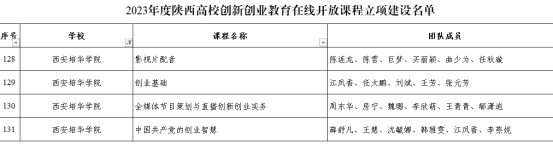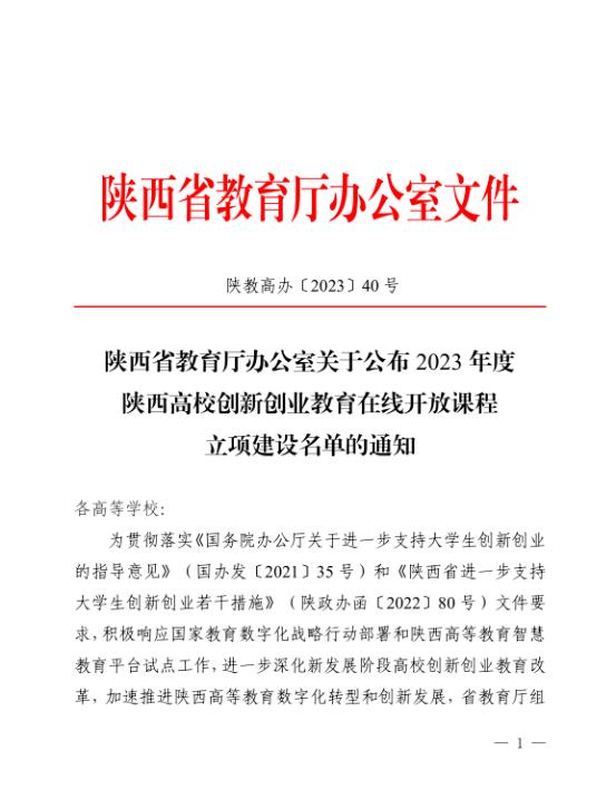 近日,陕西省教育厅发布了《关于公布2023年度陕西高校创新创业教育在线开放课程立项建设名单的通知》(陕教高办〔2023〕40号),我校陈连龙、江凤香、周东华、薛舒凡四位教师申报的课程通过了立项建设申请。