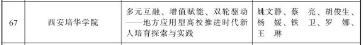 近日,陕西省人民政府办公厅、陕西省教育厅下发了《关于表彰2023年高等教育教学成果奖获奖项目的通报》,由西安培华学院副校长、党委副书记姚文静副教授主持申报的《多元互融、增值赋能、双轮驱动——地方应用型高校推进时代新人培育探索与实践》获2023年高等教育教学成果奖一等奖!这是继2019年获得陕西省教学成果一等奖之后,又一重要殊荣。