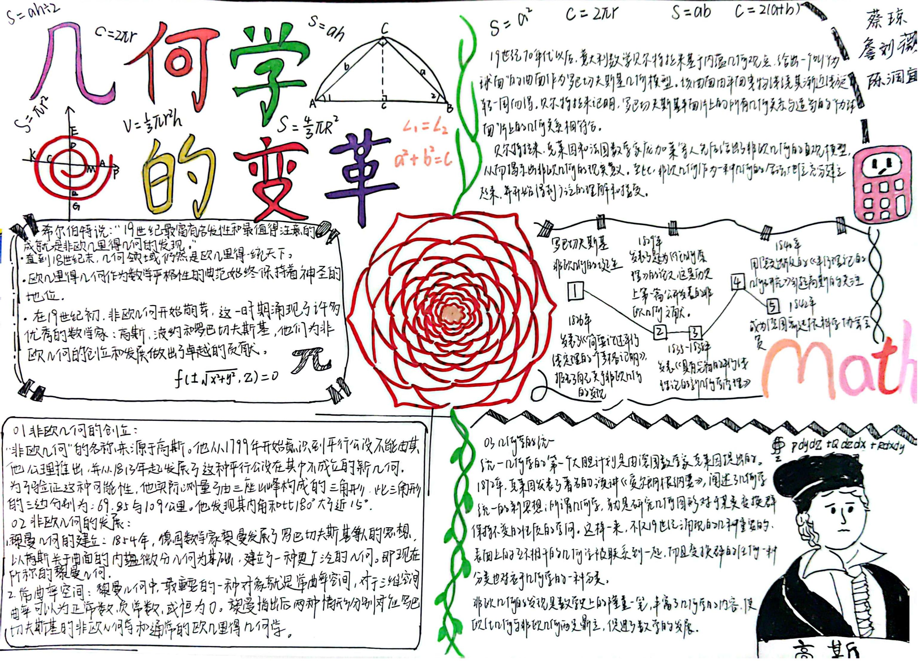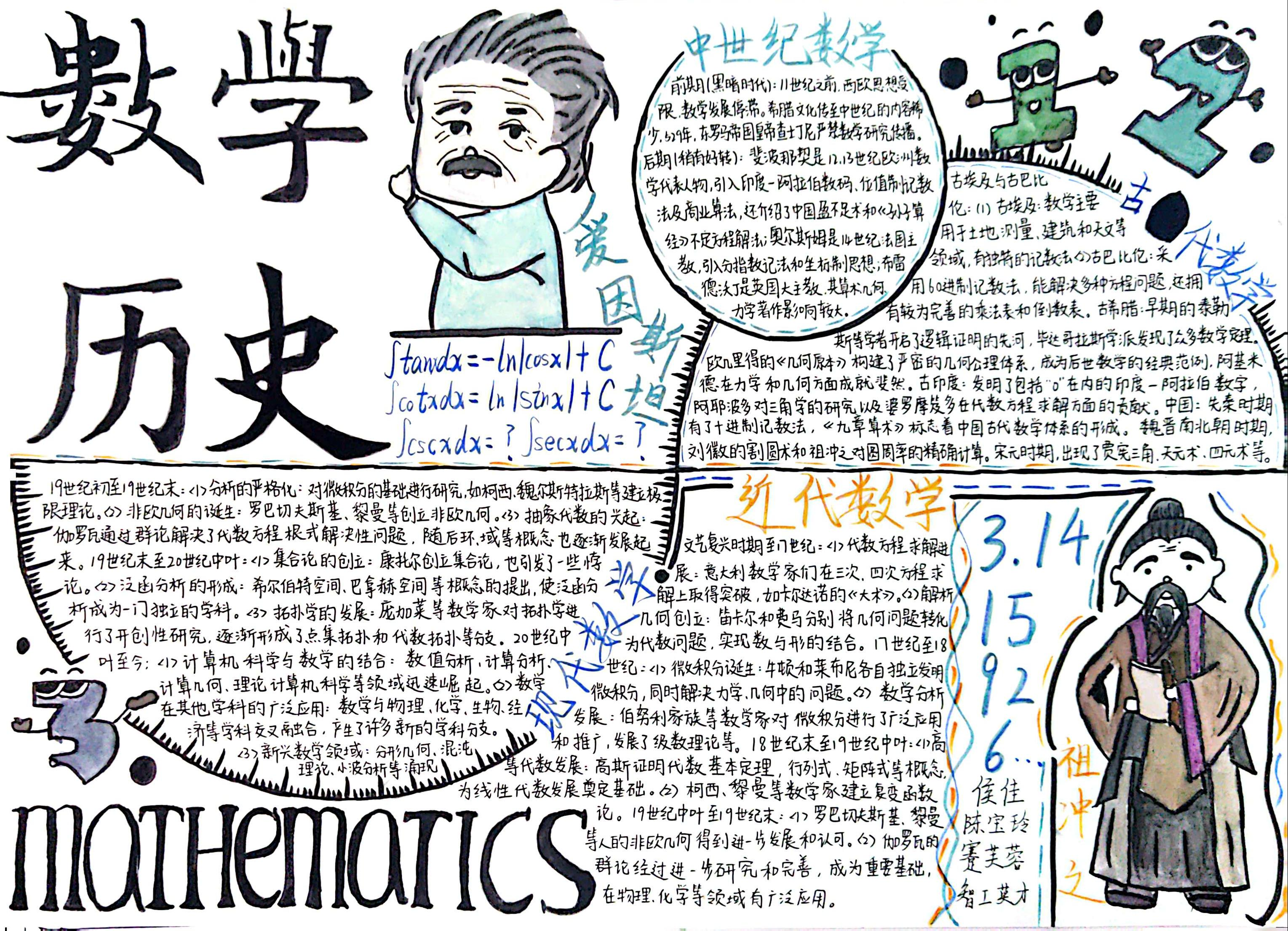 在创作过程中,同学们各展所长,将数学知识与艺术创作完美融合。有的同学用细腻的笔触绘制出祖冲之、阿基米德、牛顿、高斯等数学巨匠的肖像,搭配他们的经典理论;有的同学以趣味数学谜题、数学漫画等形式,展现数学的趣味性;还有的同学通过绘制几何学演变历程的时间轴,展现数学发展的脉络。一张张手抄报主题鲜明、内容丰富、设计精美,不仅体现了同学们扎实的数学知识功底,更彰显了他们独特的艺术创意和审美能力。