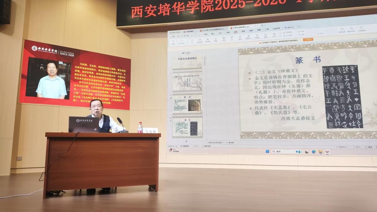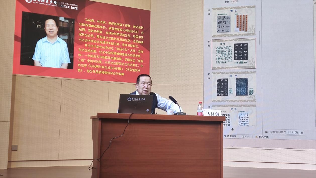 讲座伊始,马教授首先带领与会人员回顾了书法艺术波澜壮阔的发展史。从甲骨文、金文的古朴神秘,到秦篆的规范统一;从汉隶的波磔舒展,到魏晋时期楷、行、草书的高度成熟与个性化表达,讲座清晰地勾勒出汉字书写演变为独立艺术形式的完整轨迹。马教授特别强调了书法不仅是技艺的传承,更是各个时代文化精神与审美风尚的集中体现,让听众深刻地感受到每一笔、每一划背后深厚的历史积淀。