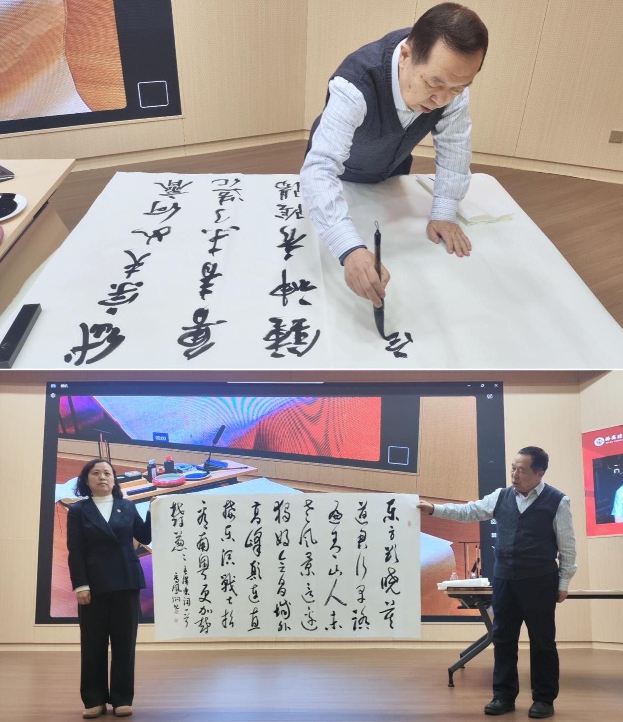 首先,胡校长对马凤炯教授的到来表达了诚挚的欢迎和衷心的感谢,他充分肯定了马教授在书法领域的专业性和个人素养,并向参会人员介绍了马凤炯教授,教授级高级工程师,曾先后担任陕西省邮政局局长,陕西省邮政公司党组书记、总经理,省政协常委,省政协科技委副主任。中国书法家协会会员,陕西省书法家协会原副主席,全国邮政书法美术家协会首届常务副主席,秦驿书院院长。其书法作品先后参加过“美丽中华”大陆、港澳台书法巡回展,北京中国军事博物馆举办的国宝集珍——全国百名书画家作品邀请展,受邀参加“丝绸之路”全国书法展、中日书法展等多次书法展出。先后出版《马凤炯行草毛泽东诗词集》《马凤炯隶书集》,部分作品被博物馆和会所收藏。