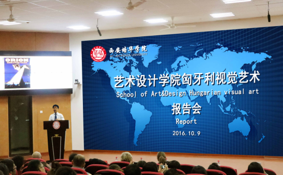 2016年10月9日上午10:00——12:00我院在汇知楼学术报告厅举办匈牙利阿提拉·塔什纳蒂Attila Tasnády先生视觉艺术活动,由匈牙利绘画艺术和当代视觉艺术专家主讲,随同人员有尹曼妮——北京匈牙利文化中心干事。参与此次活动的有理事长姜波博士、西安培华学院副校长刘越莲教授、艺术设计学院院长杨志勇教授、 艺术设计学院副院长东会峰副教授、艺术设计学院党总支书记王飞以及专业老师和学生。