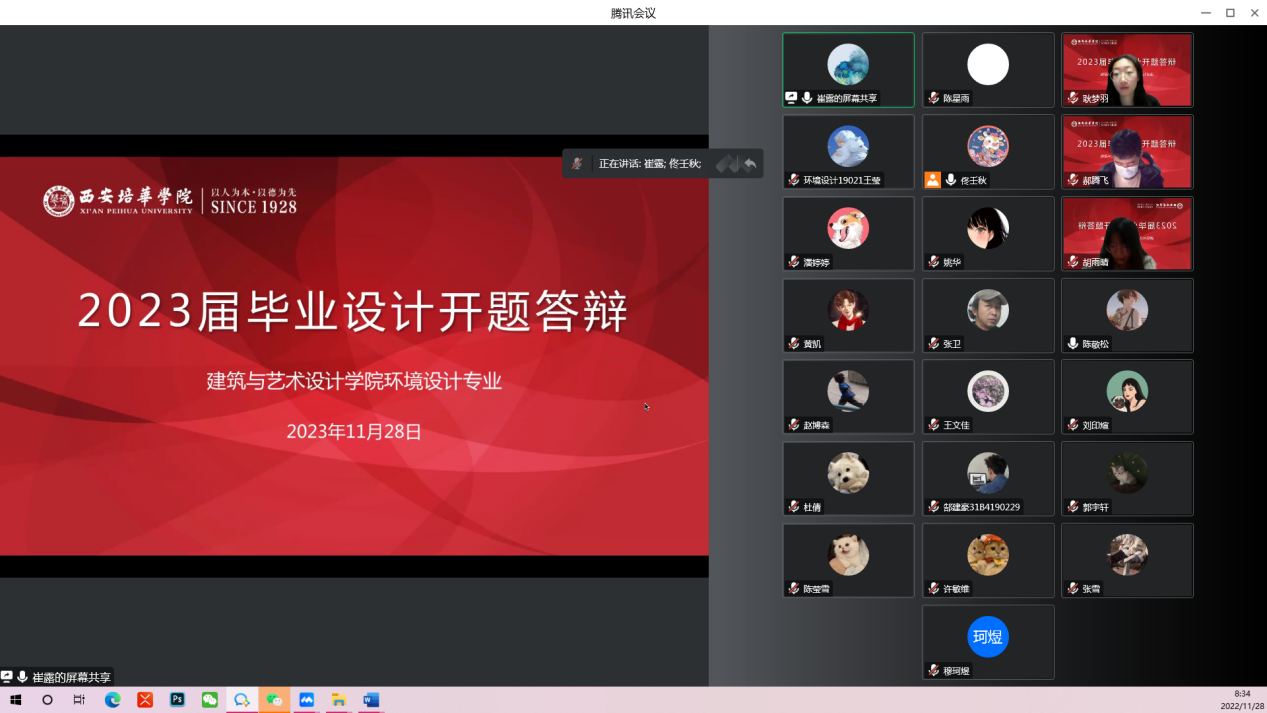 根据学校关于2023届毕业设计的工作安排,环境设计专业于11月28日进行了本届毕业设计的开题答辩环节。答辩采用线上形式进行,共抽取本届9名毕业生,担任答辩评委的有:答辩组长张卫副教授、环境设计专业带头人佟壬秋老师、专业教师王文佳老师、答辩秘书崔露老师;出席答辩的还有我院院长助理刘清颖副教授、我院教学干事李姝琦老师、毕业设计企业导师齐璐高级工程师;新进专业教师陈星雨老师、杜倩老师参与并进行了辅助工作。