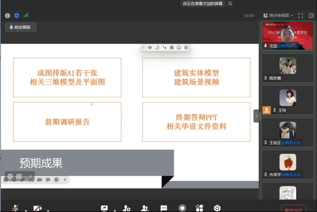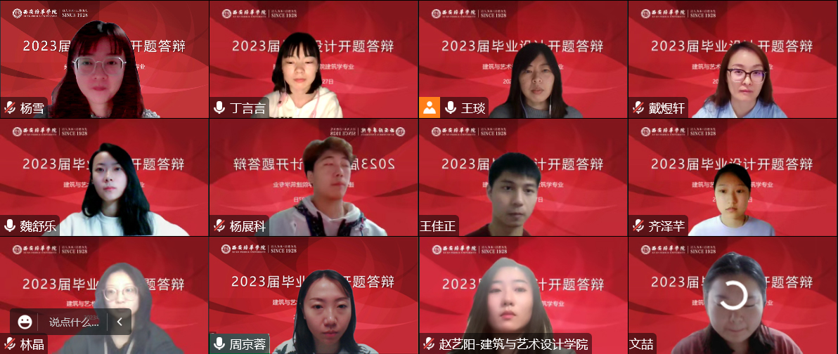 根据建筑与艺术设计学院对疫情防控期间做好本科生毕业设计开题答辩的相关要求,建筑学专业于11月27日上午9:00开展了2023届建筑学专业毕业设计开题答辩,本次答辩在腾讯会议线上平台通过PPT展示、视频共享等方式进行。答辩组长由王琰老师担任,魏舒乐、戴煜轩、赵艺阳、杨雪老师担任答辩评委,周京蓉老师担任答辩秘书,参加答辩学生共6名。