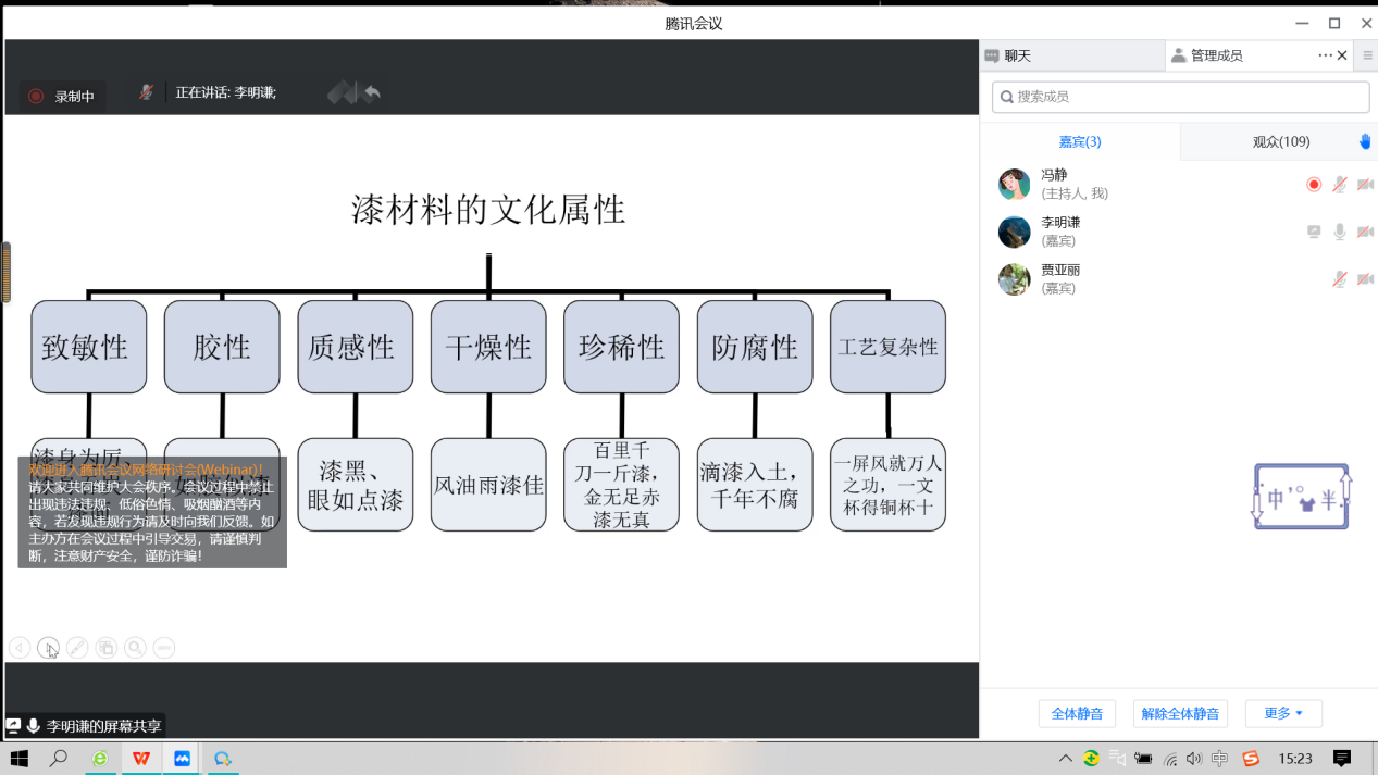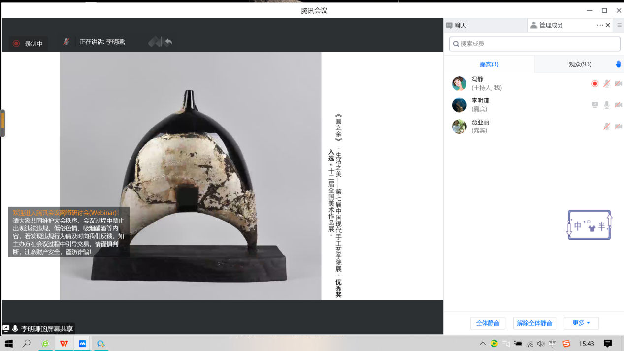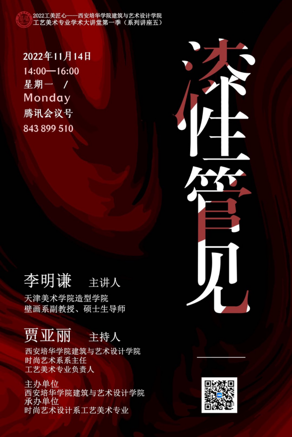 2022年11月14日下午,建筑与艺术设计学院工艺美术专业学术大讲堂(第一季)系列讲座第五场顺利进行,主讲嘉宾李明谦副教授以“漆性管见”为主题展开本次线上讲座。