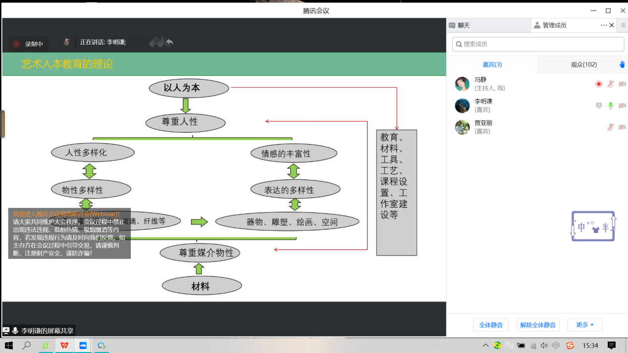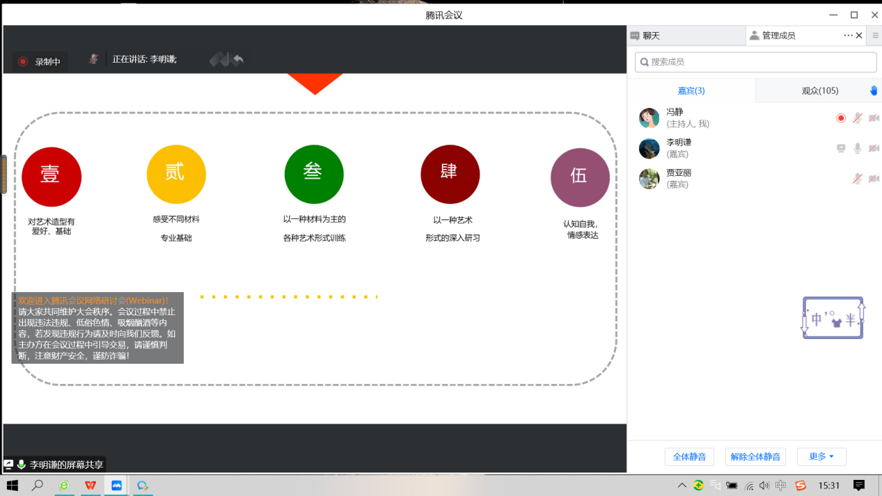 接下来,李明谦老师讲解了他从教学中总结的工艺美术人才培养的几个方面,要了解中国传统文化;拥有自己独特的艺术语言;要具有时代性、文化特征和时代精神;从艺术形式的方面,要具备专业性、系统性、物化性。李老师还提到在教学中我们要遵循人本教育理论,以人为本,尊重人性。同样从工艺美术的角度,我们要尊重物性。