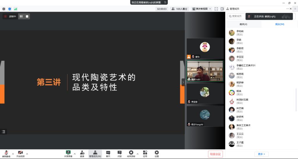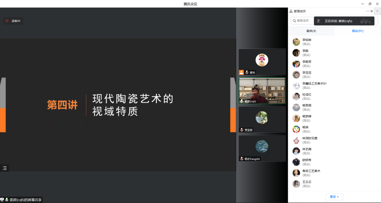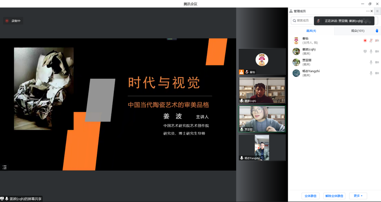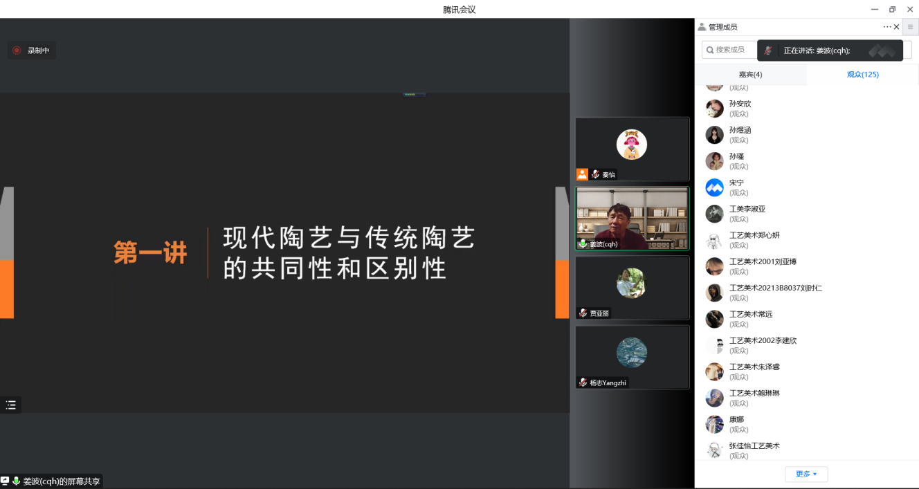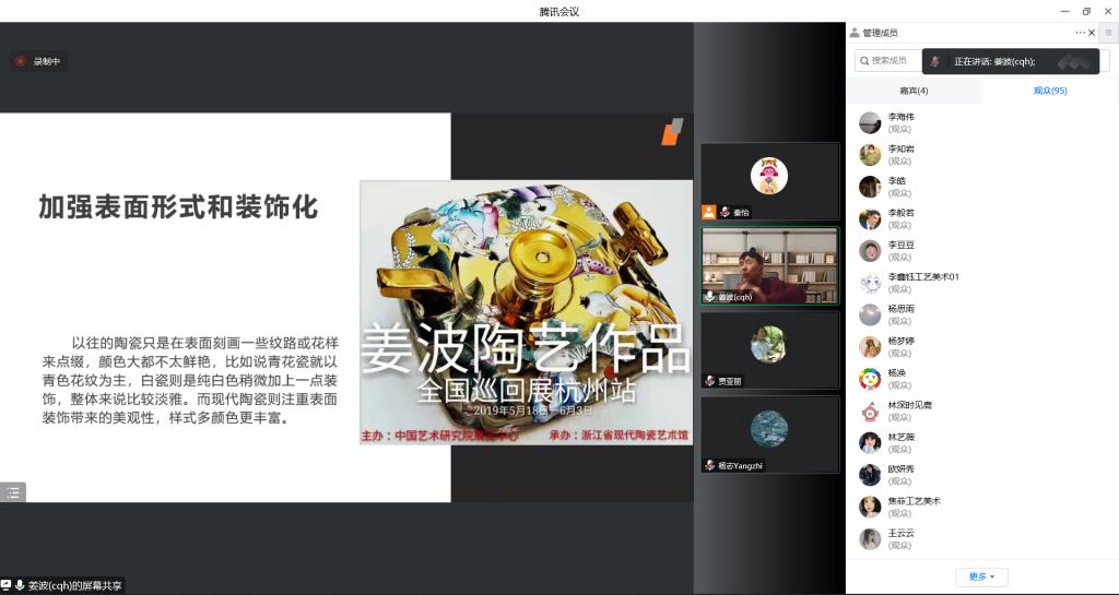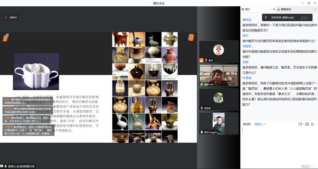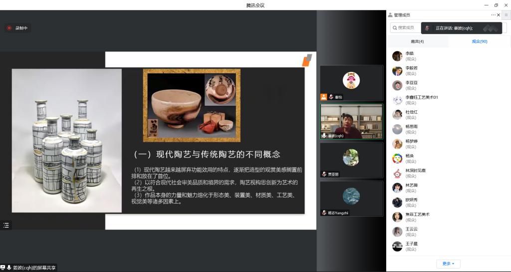 2022年11月11日下午,建筑与艺术设计学院工艺美术专业学术大讲堂(第一季)系列讲座第四场顺利进行,主讲嘉宾姜波教授以“时代与视觉一一中国当代陶瓷艺术的审美品格”为主题展开本次线上讲座。