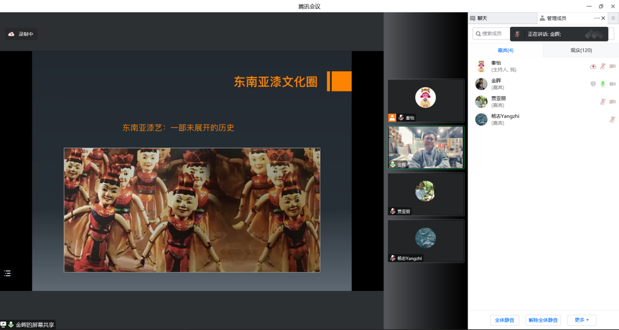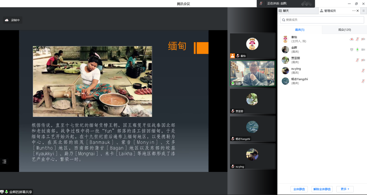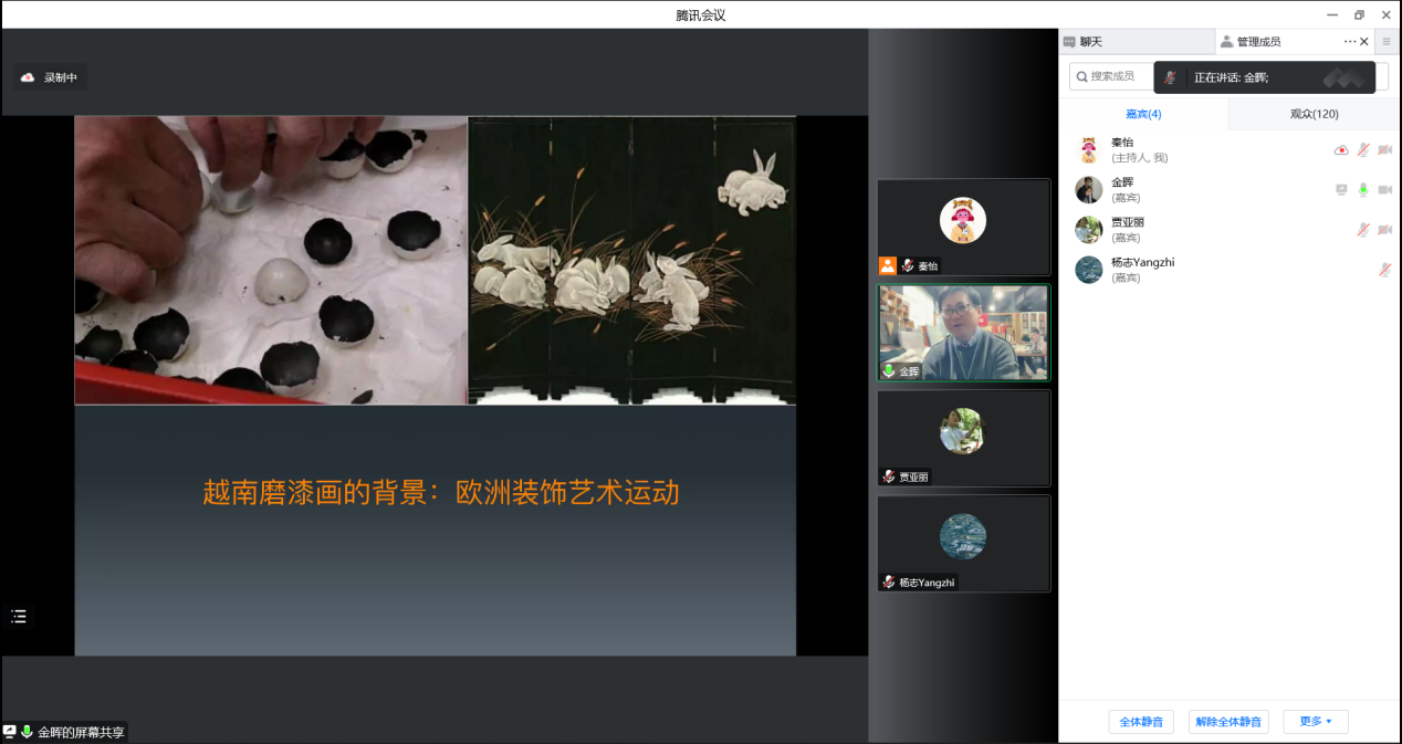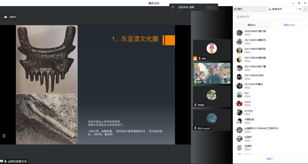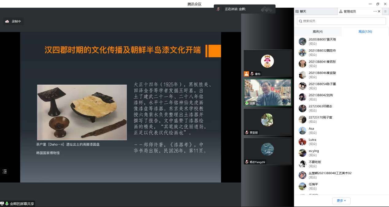 2022年11月4日下午,建筑与艺术设计学院工艺美术专业学术大讲堂(第一季)系列讲座第二场顺利进行,主讲嘉宾金晖教授以“亚洲漆文化圈的当代构建”为主题展开本次线上讲座。