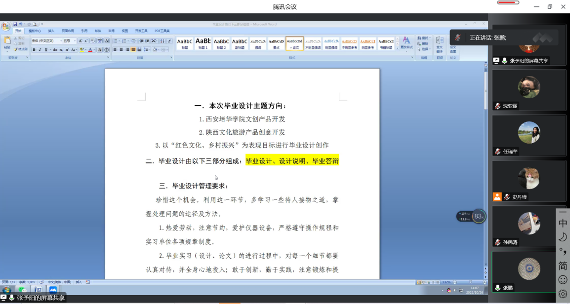 会上,张予阳老师对2023届毕业设计主题方向及毕业设计管理要求等做了详细介绍,同时指出,同学们要将自己所学的理论知识和专业技能充分结合,才能做好毕业设计。希望同学们发散思维,开拓创新,并且及时与指导老师进行沟通,从中获得指导,毕业设计严禁抄袭,要求原创。其次,张予阳老师向我们详细地介绍毕业设计流程安排和重要时间节点的任务安排。