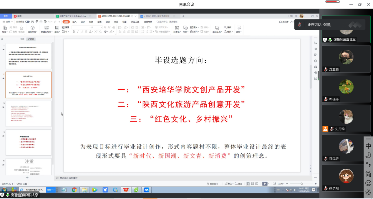 会上,张鹏老师详细讲解2023届毕业设计的目的意义及毕业设计选题的详细解读。毕业设计是高等院校专业实践教学的重要环节与课程,是一项全面运用专业知识和专业技能开展的综合性设计实践活动。视觉传达设计专业毕业设计是学生专业素质和专业实践能力全面提升的重要途径,也是对学生本科四年专业知识学习的综合性考查和总结。同时,张鹏老师给学生详细阐述了本次毕业设计的选题方向,毕业设计的表现形式要具有“新时代、新国潮、新文青、新消费”的创意策划理念。注重与时代现象的紧密结合,注重前瞻性思维的培养,注重设计服务于生活。