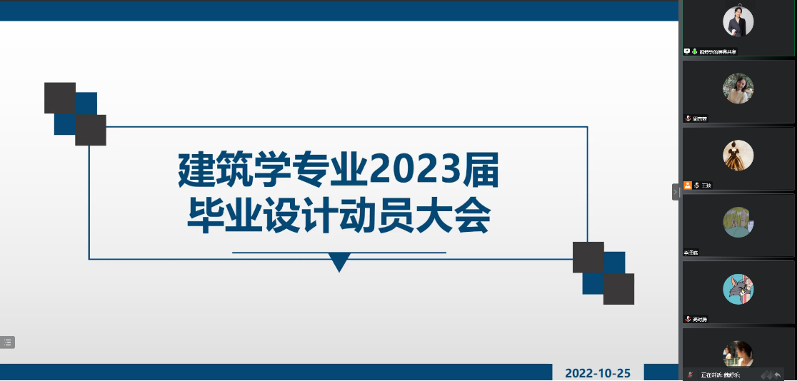 为有效落实建筑学专业毕业设计工作,提高毕业设计质量等相关事宜,2022年10月25日,我院建筑学专业在线上召开2023届本科毕业设计动员会。本次动员大会由建筑学专业2023届全体毕业生及毕业设计指导教师参加。