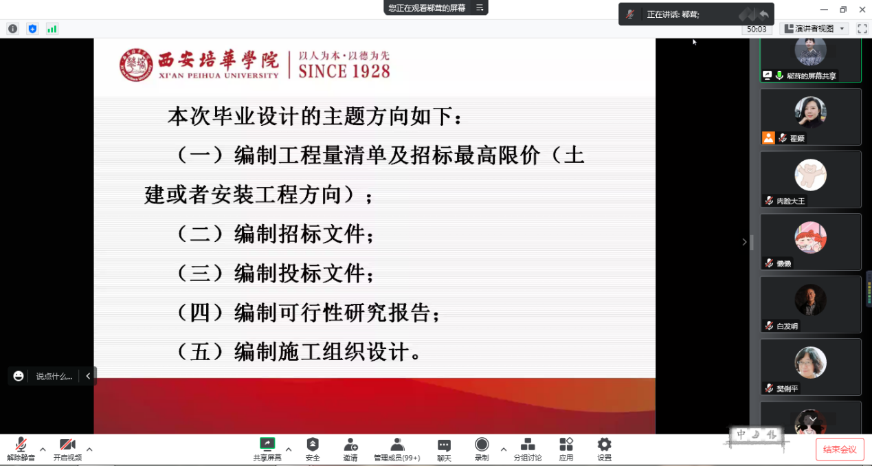 出席本次会议的有工程造价专业带头人白发明老师、工程造价系系主任杨锦老师、工程造价系系副主任郗茸老师、其他毕业设计指导教师及工程造价2023届全体毕业生。