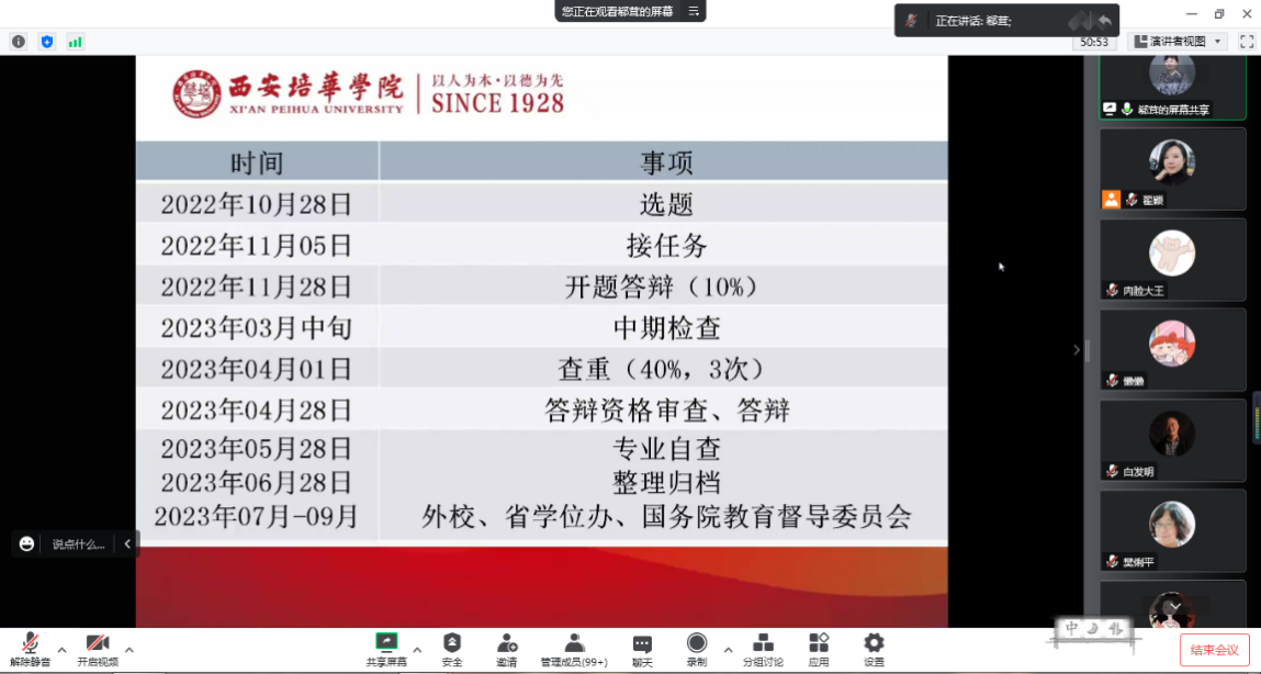 经过白老师和郗老师的讲解,同学们对毕业设计有了更深刻的认识和更详细的时间计划,希望2023届毕业生能够认真筹备、遵守学术道德与学术规范、如期、圆满完成毕业设计任务!