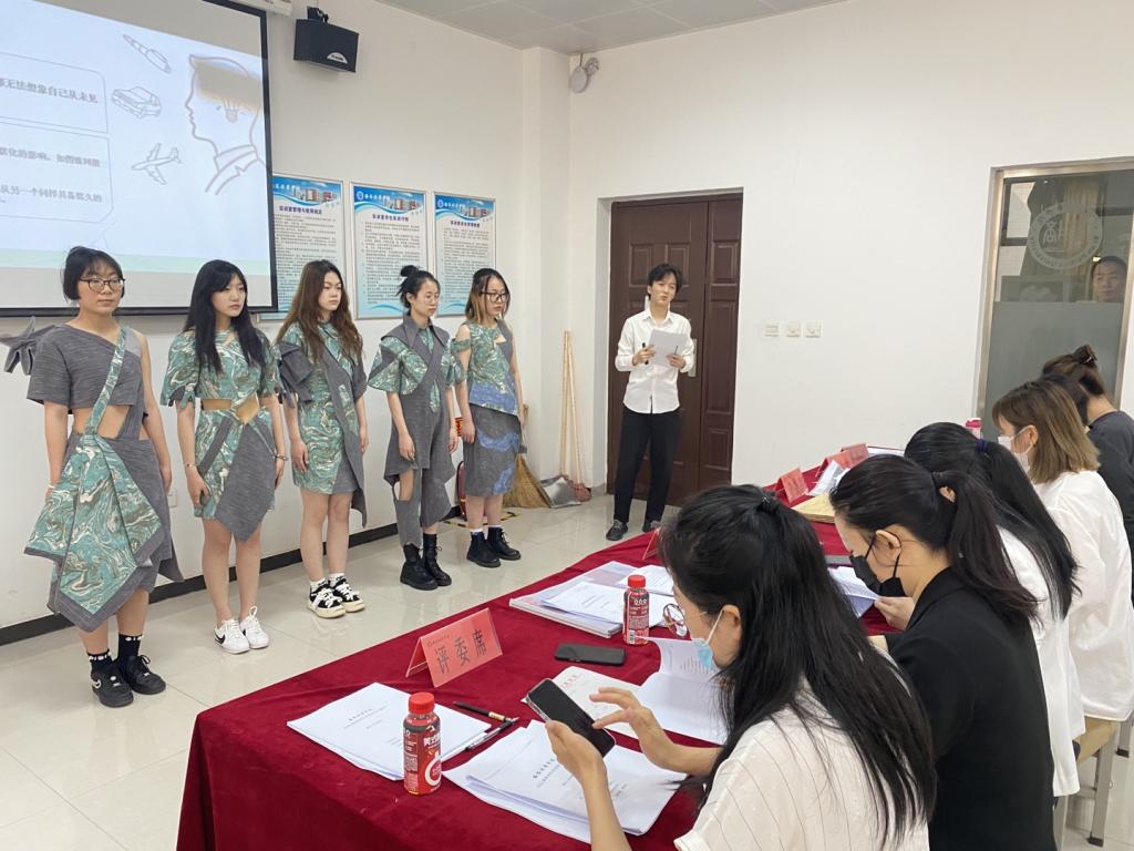 毕业设计答辩环节分为学生陈述、服装展示、老师点评与提问、学生回答等环节。答辩的同学通过PPT介绍自己毕业设计的选题灵感来源、设计调研背景、制作过程、成衣拍摄大片等,再结合现场的服装展示介绍制作工艺与设计亮点。老师们对学生的汇报内容进行提问并给与修改意见。